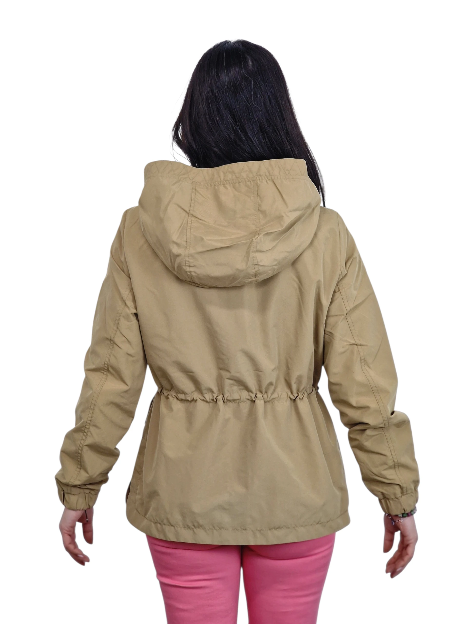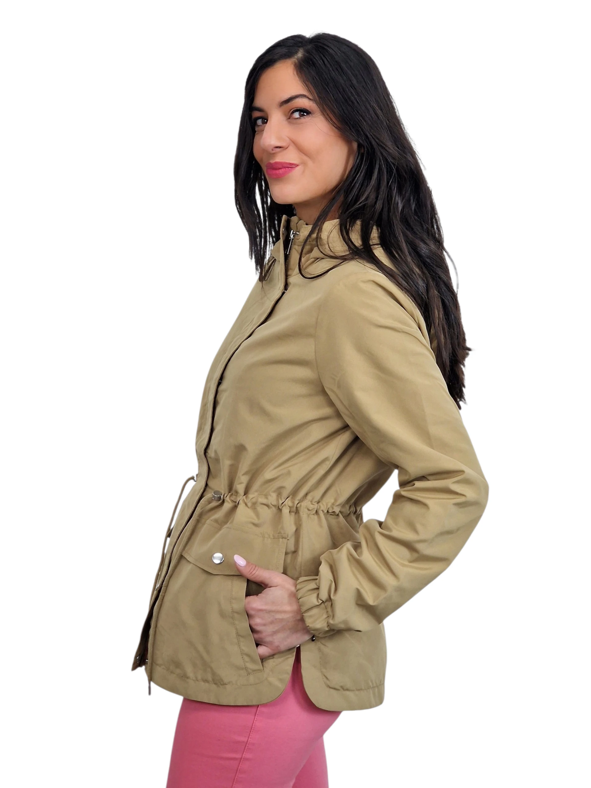 Parka cort a de entrertiempo con capucha y cordón para ceñir cintura. disponible en camel y marino.