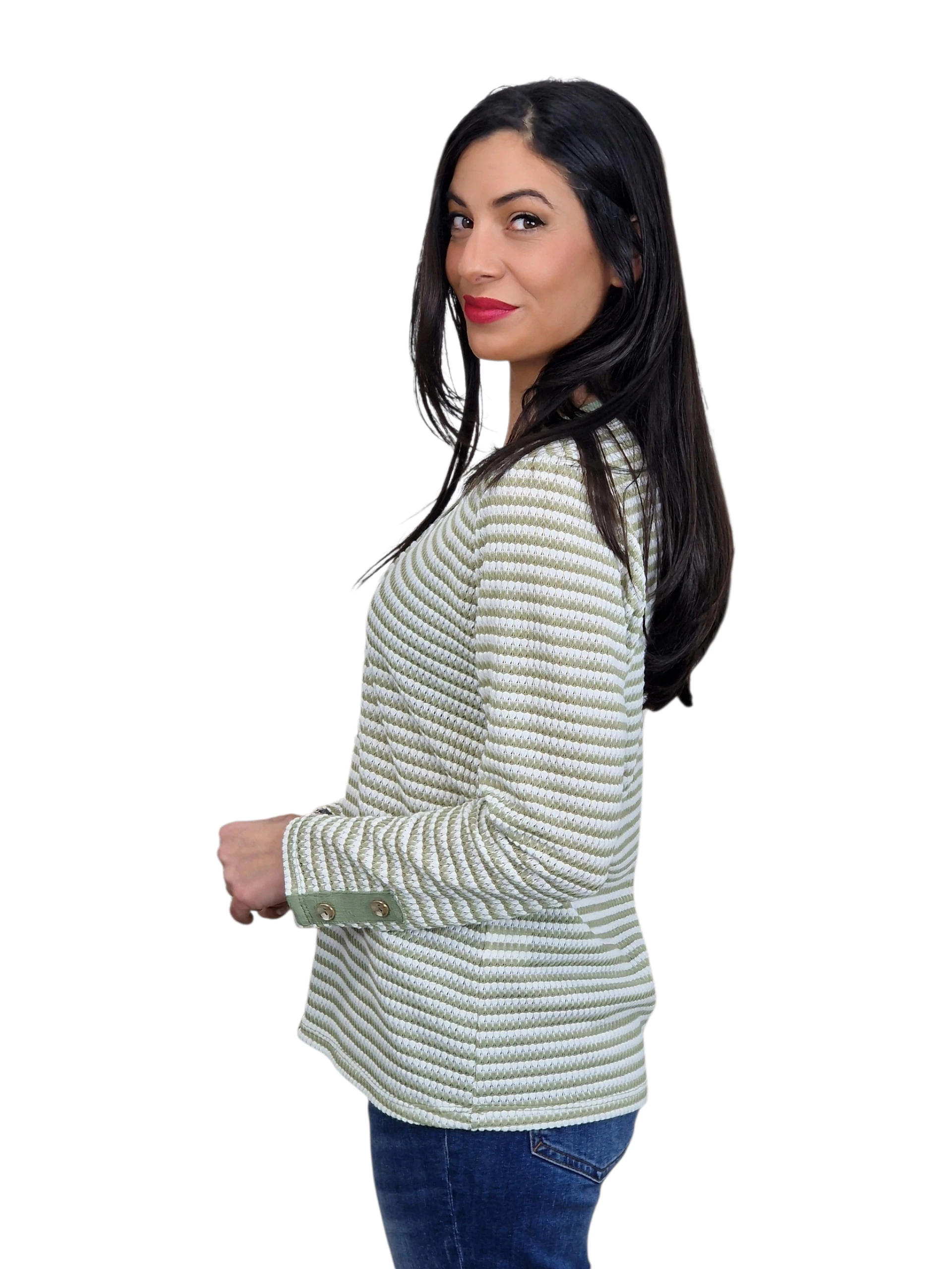 Suéter de cuello pico estampado en líneas finas. Disponible en marino, arena y verde.
