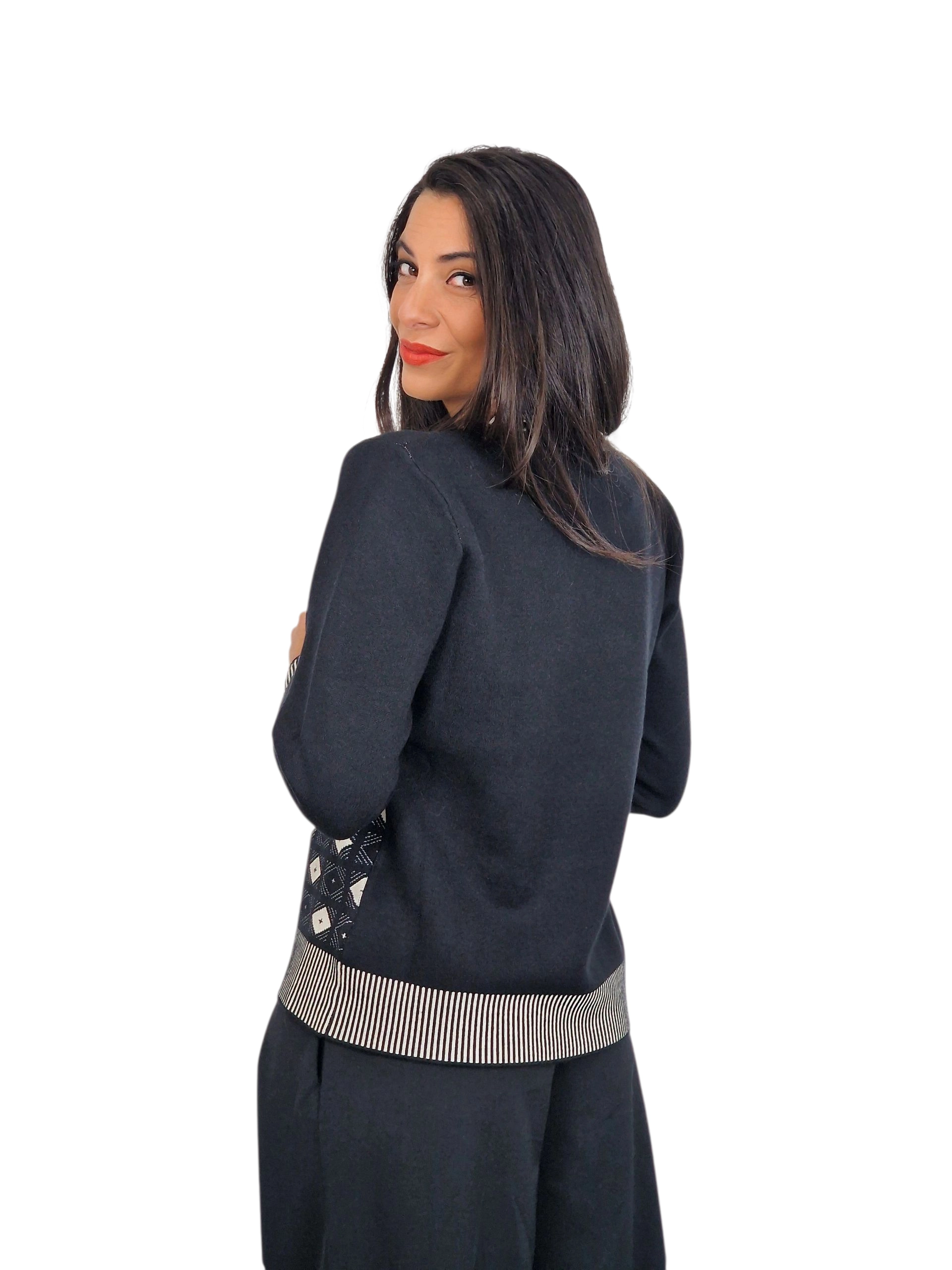 Suéter negro con cenega en cuello, puños y elástico inferior en crema. Estampado geométrico ene el mismo color.