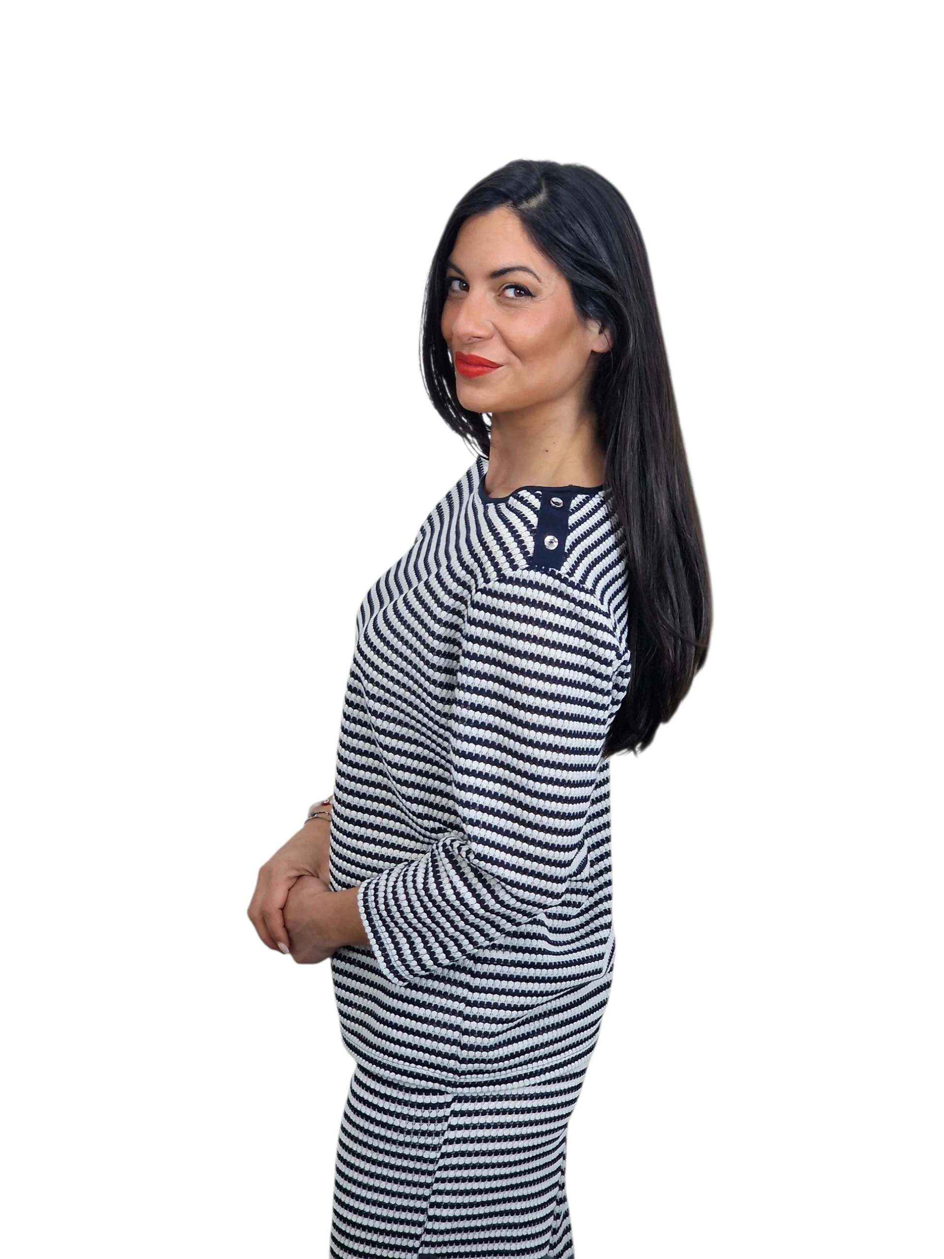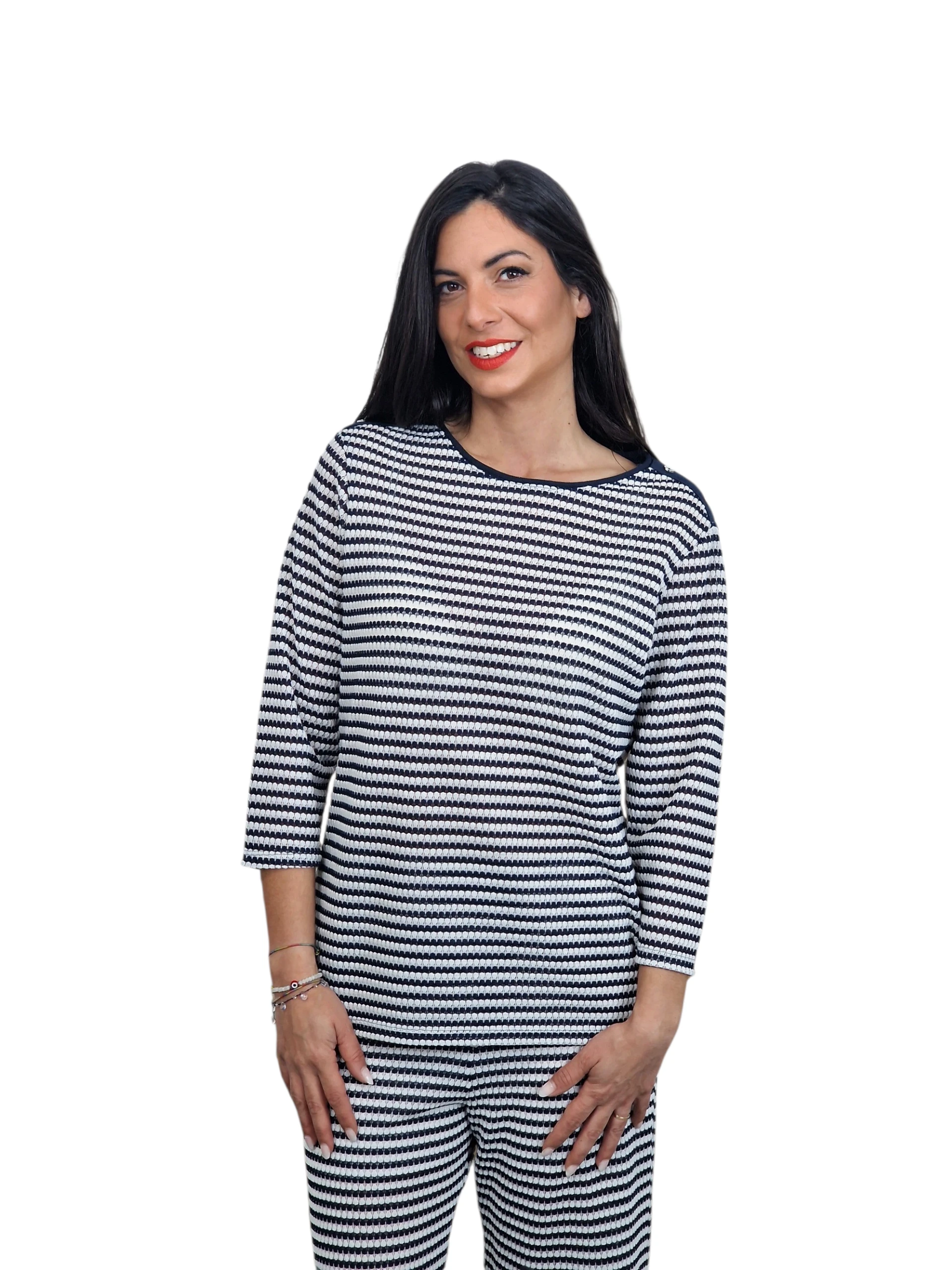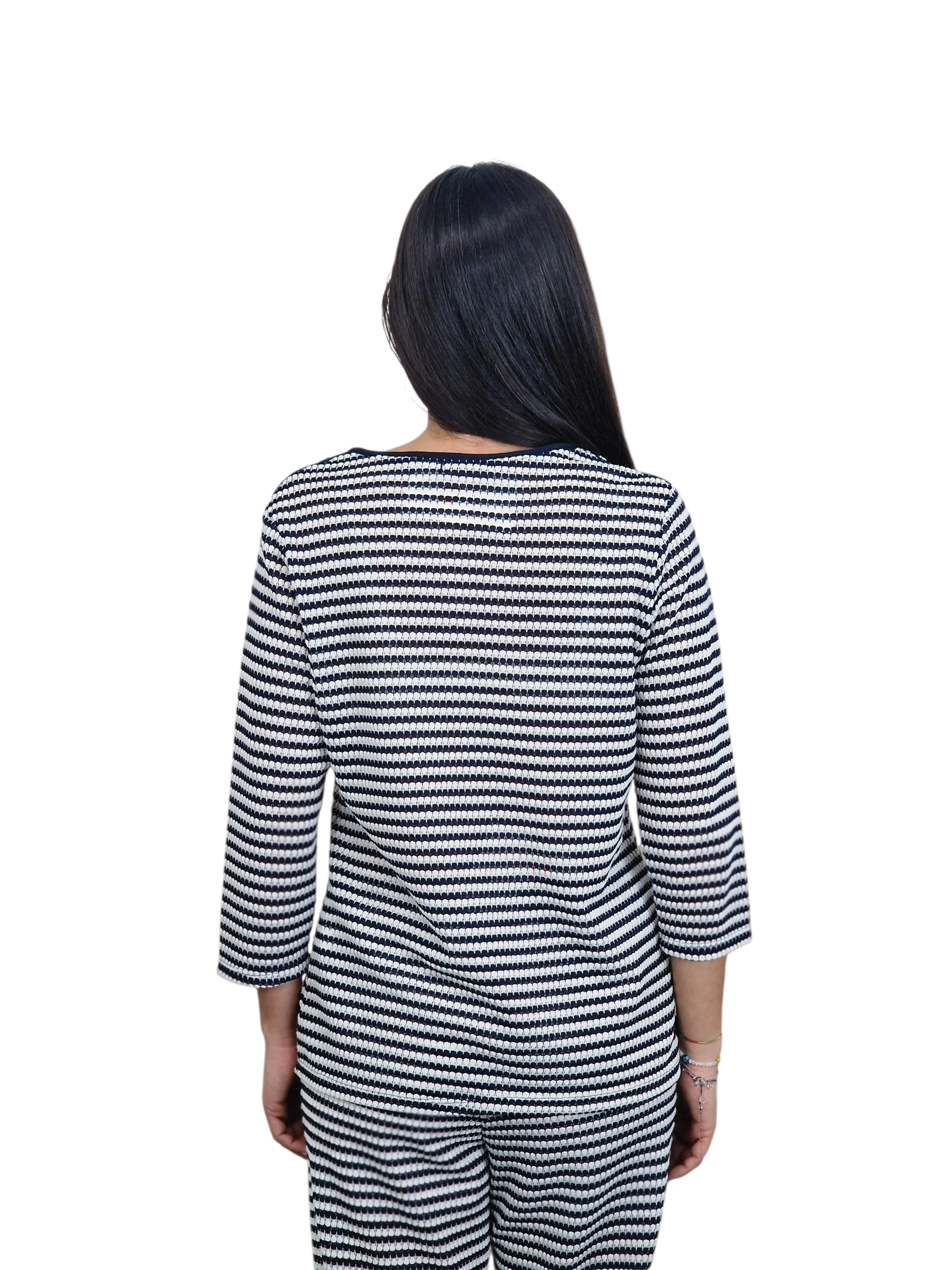 Suéter de punto creando rayas con topos, con bolsillos, tobillero y unos botones en el hombro izquiero. A conjunto con pantalón ref. P 40293. Disponible en azul marino, arena y verde