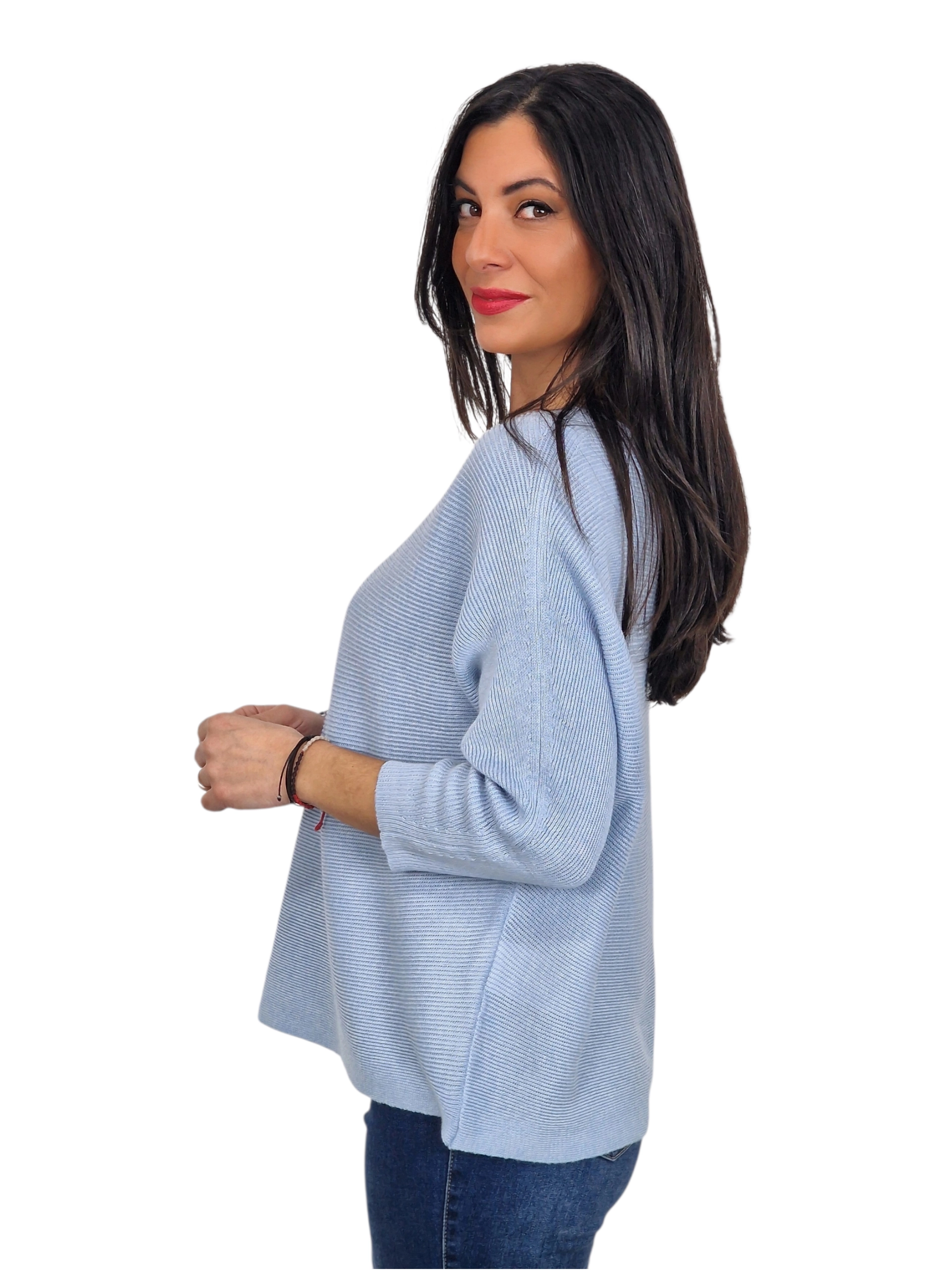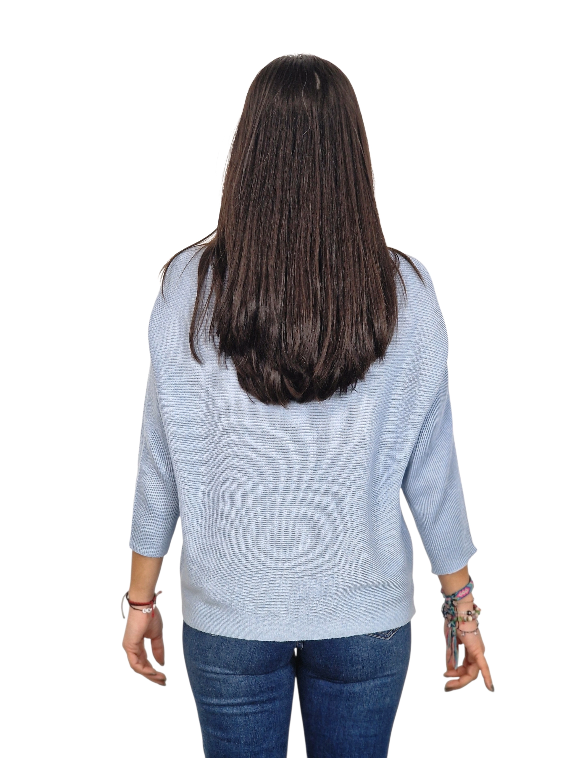 Suéter de punto con cuello barco y manga francesa. Disponible en crudo, coral y celeste.