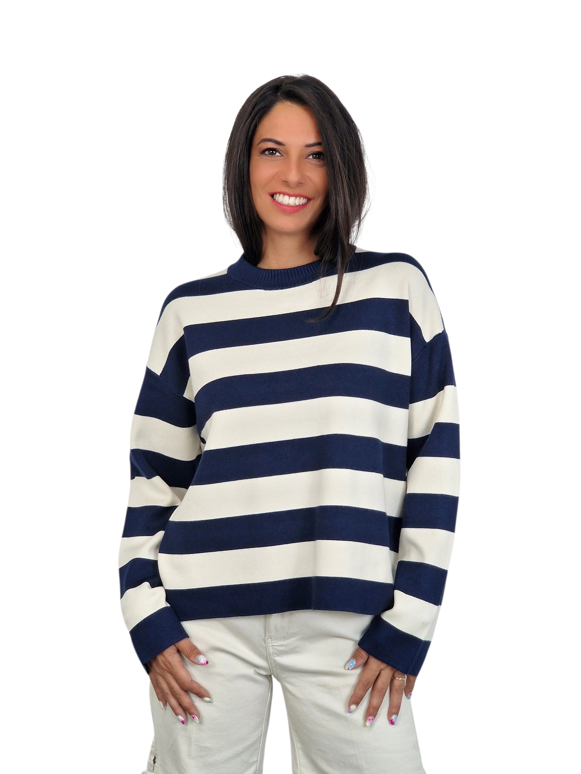 Suéter de cuello redondo con estampado en franjas anchas. Disponible en marino, rosa palo, marrón y pruma.