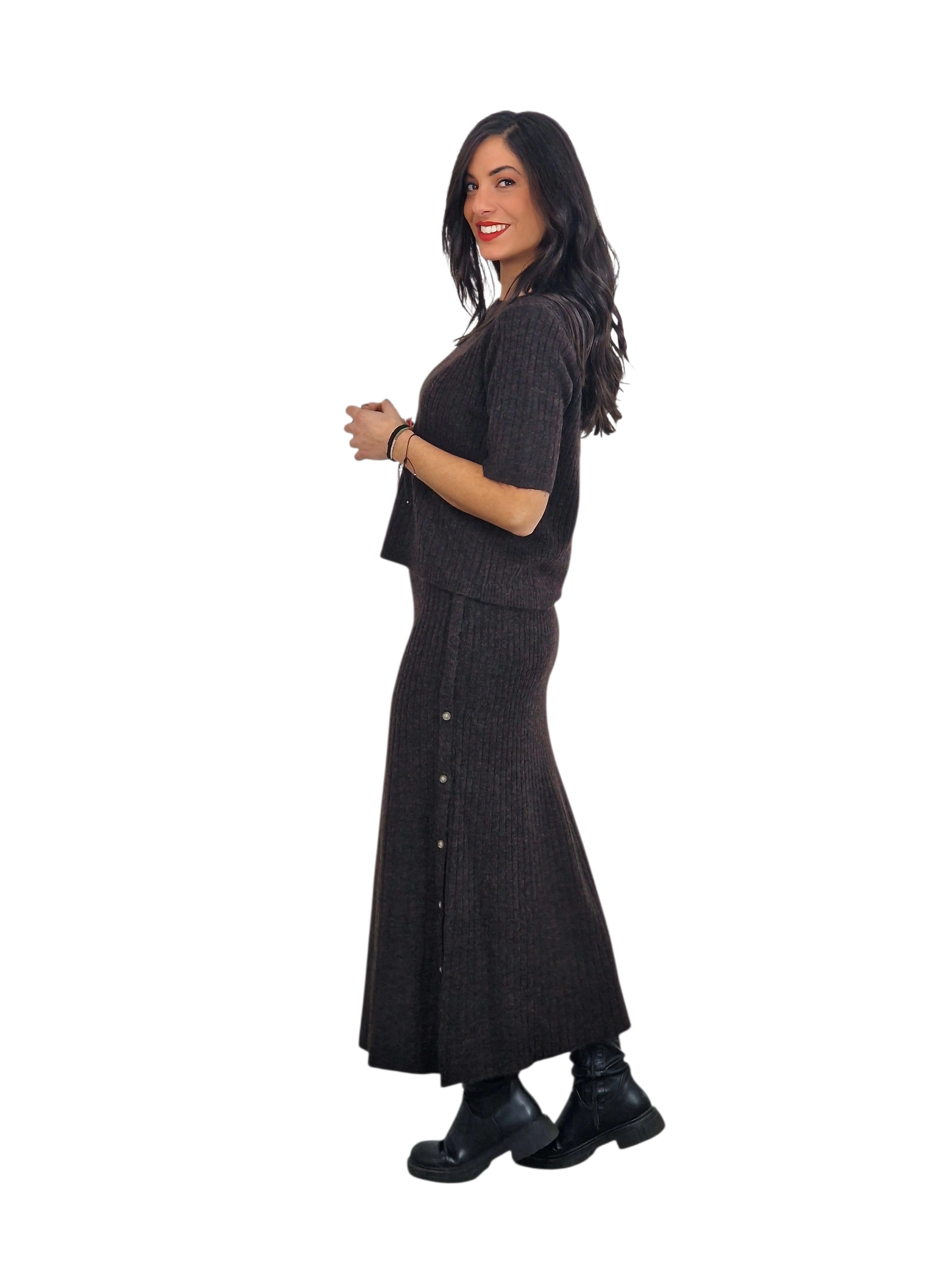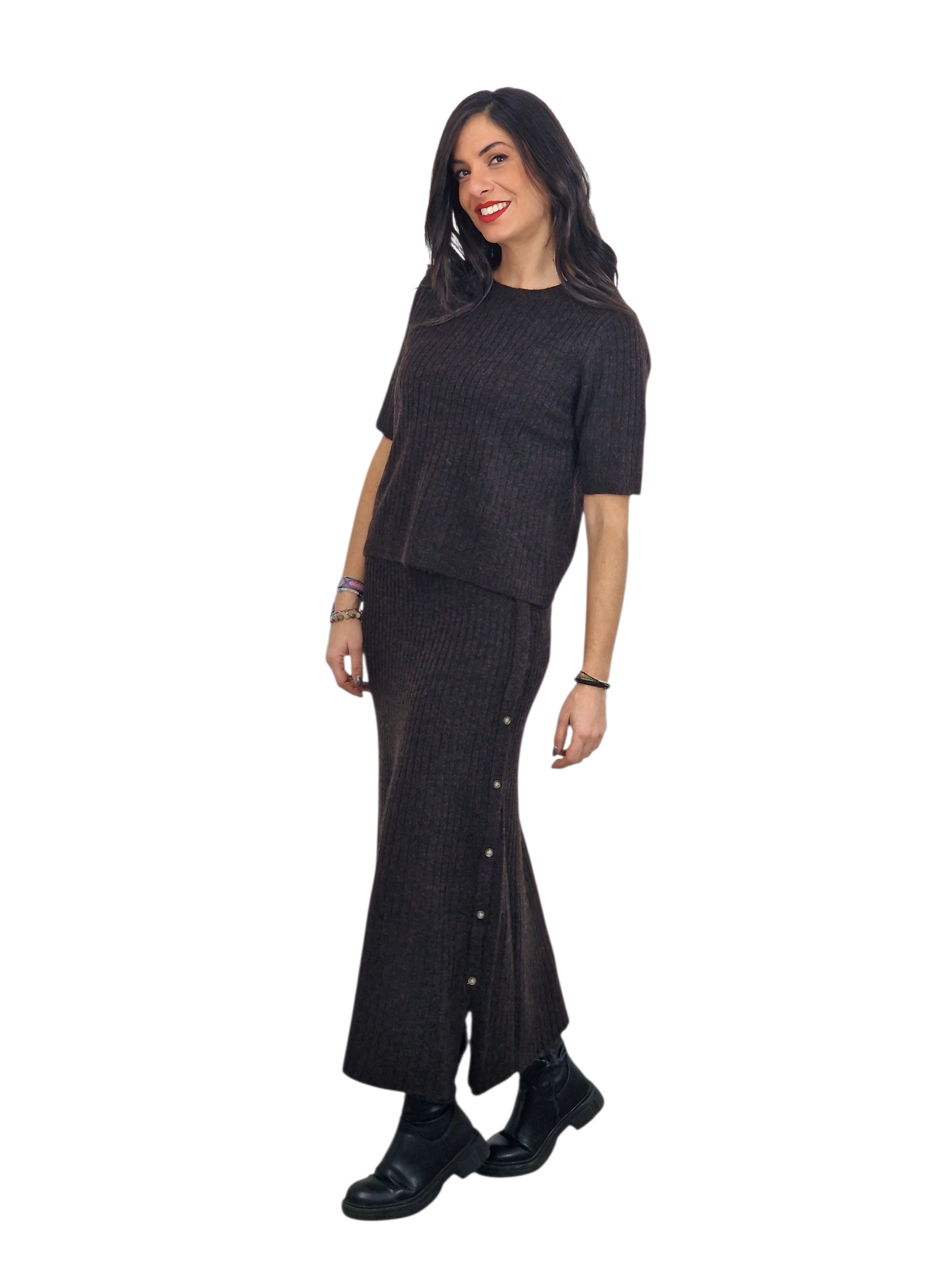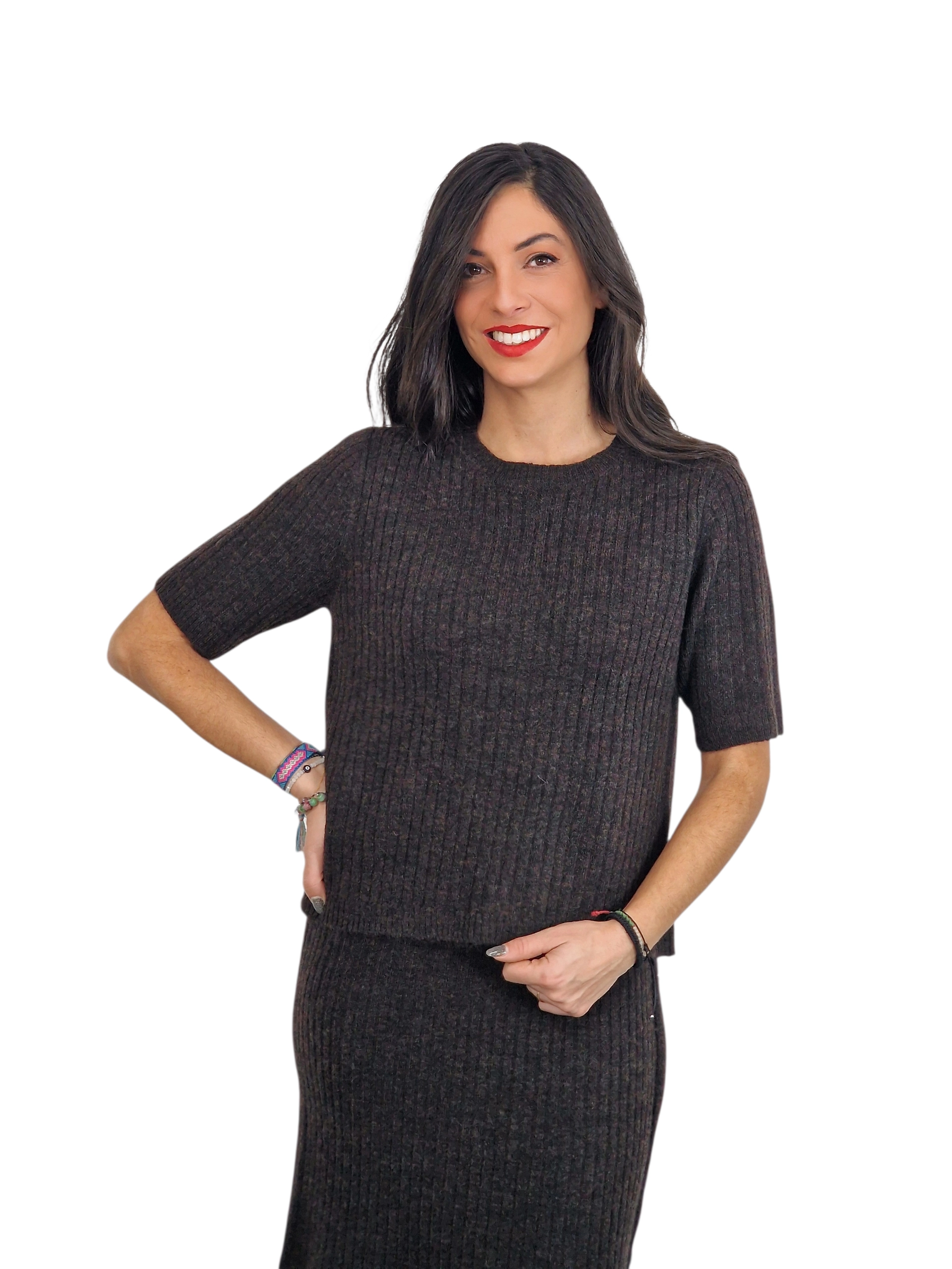 Suéter de manga corta en canalé a juego con falda. Disponible en marrón, gris medio y pruma.