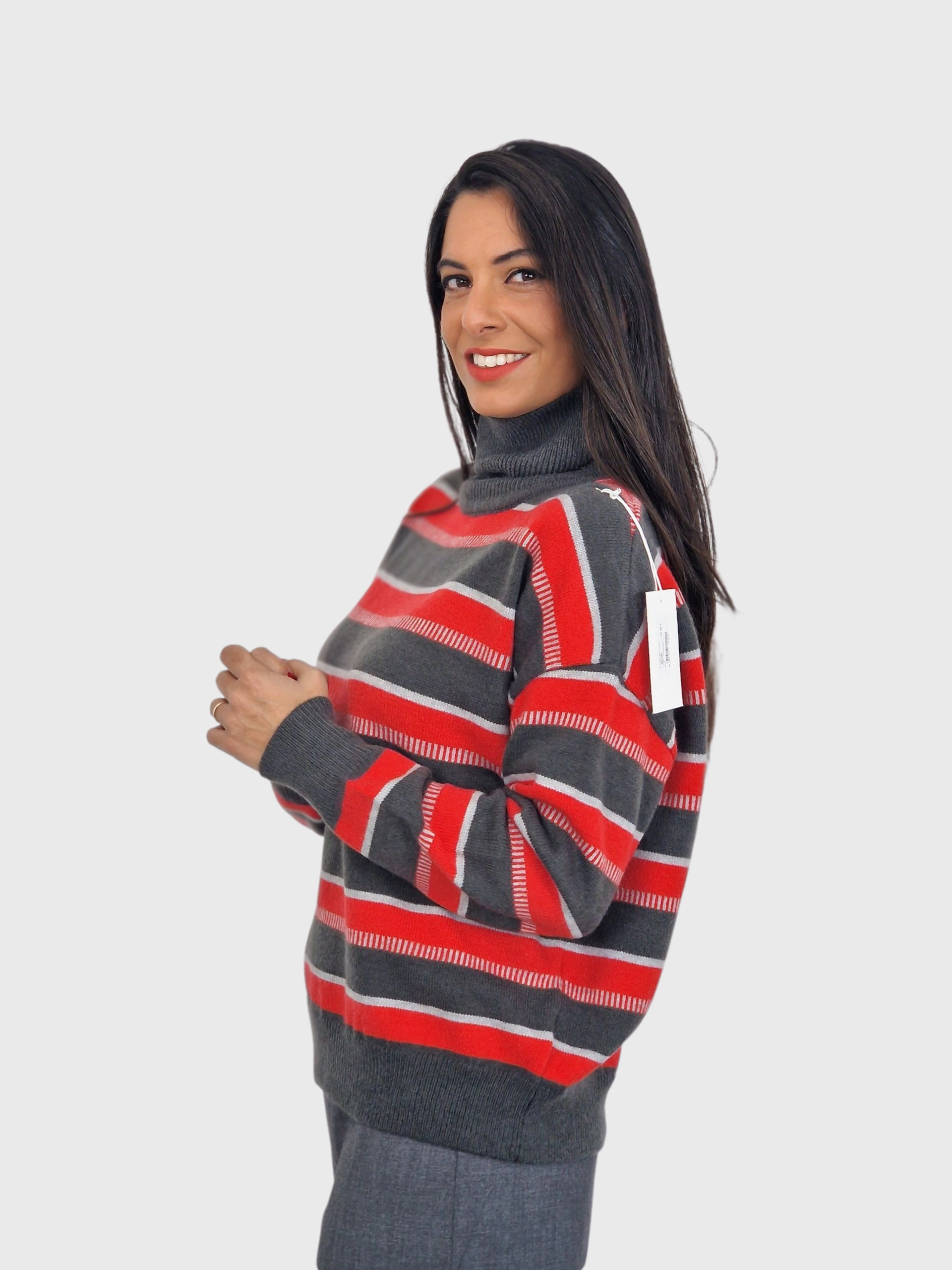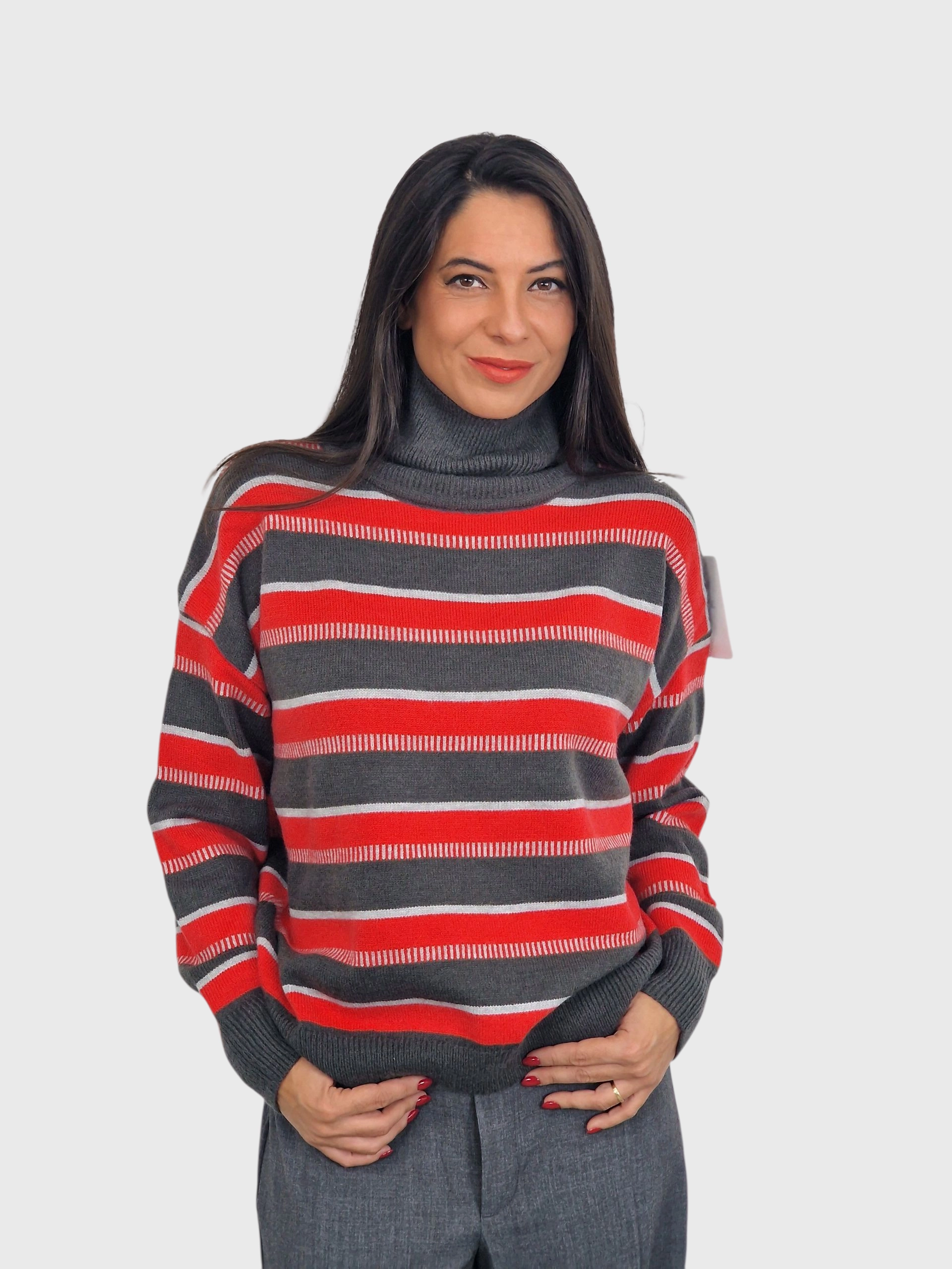 Suéter de punto de rayas anchas y cuello vuelto. Disponible en azul marino, verde kaki y gris oscuro.