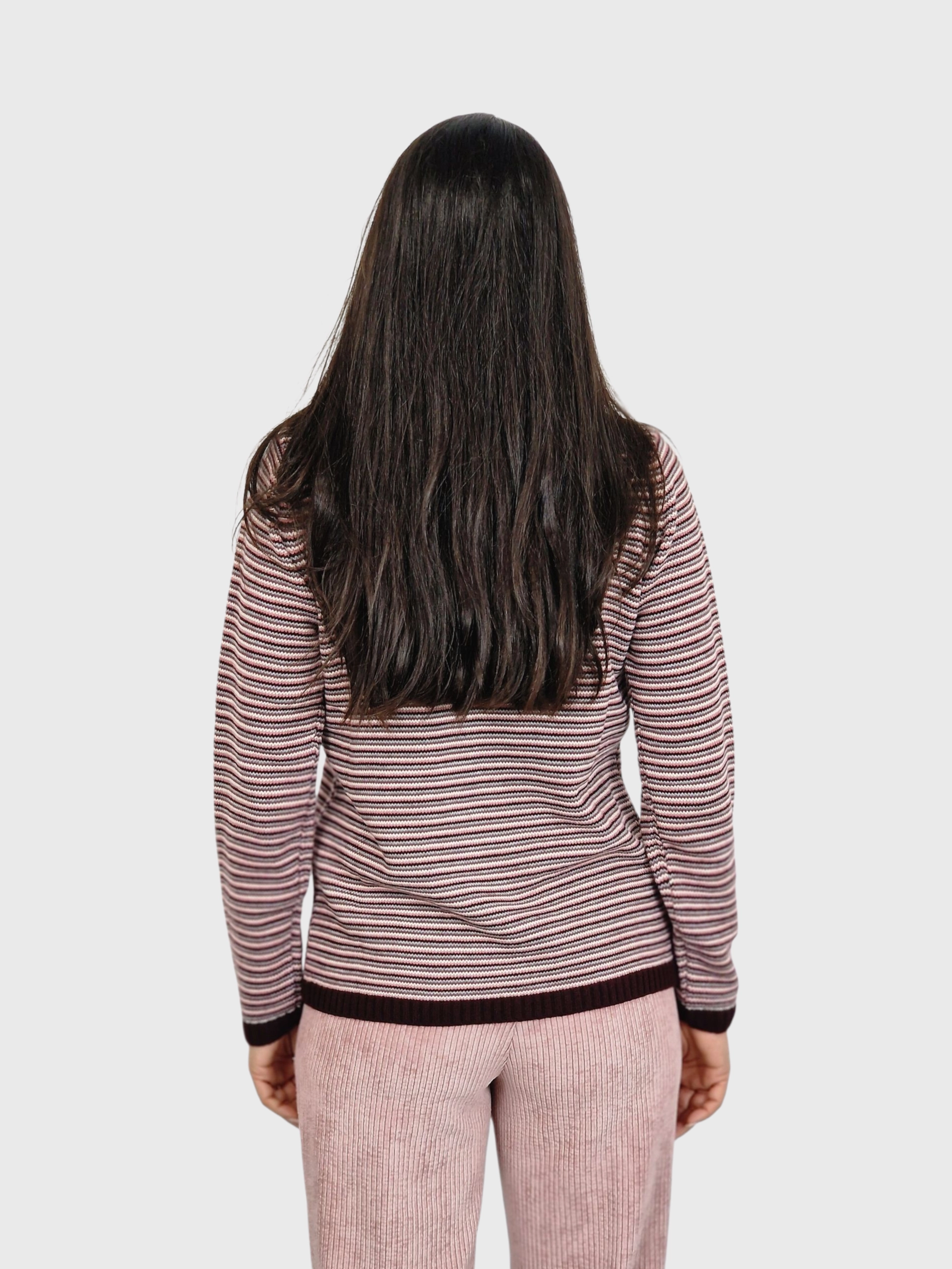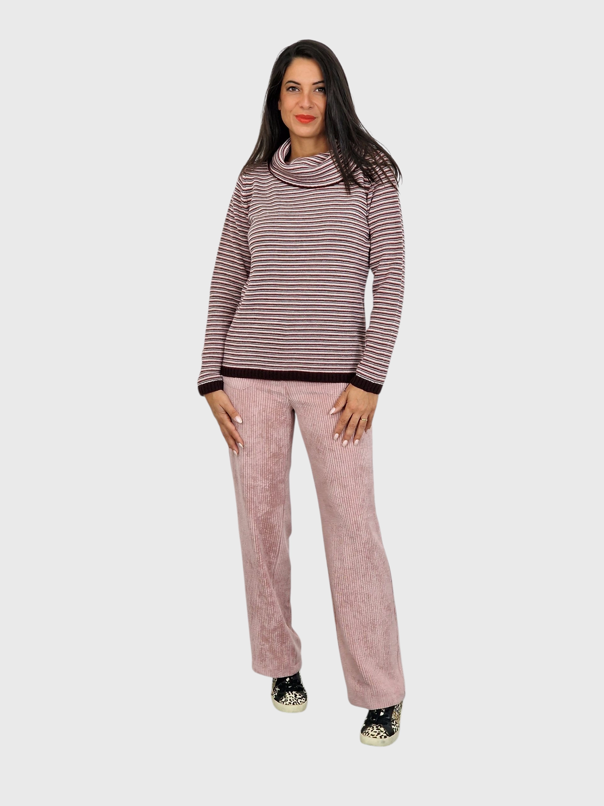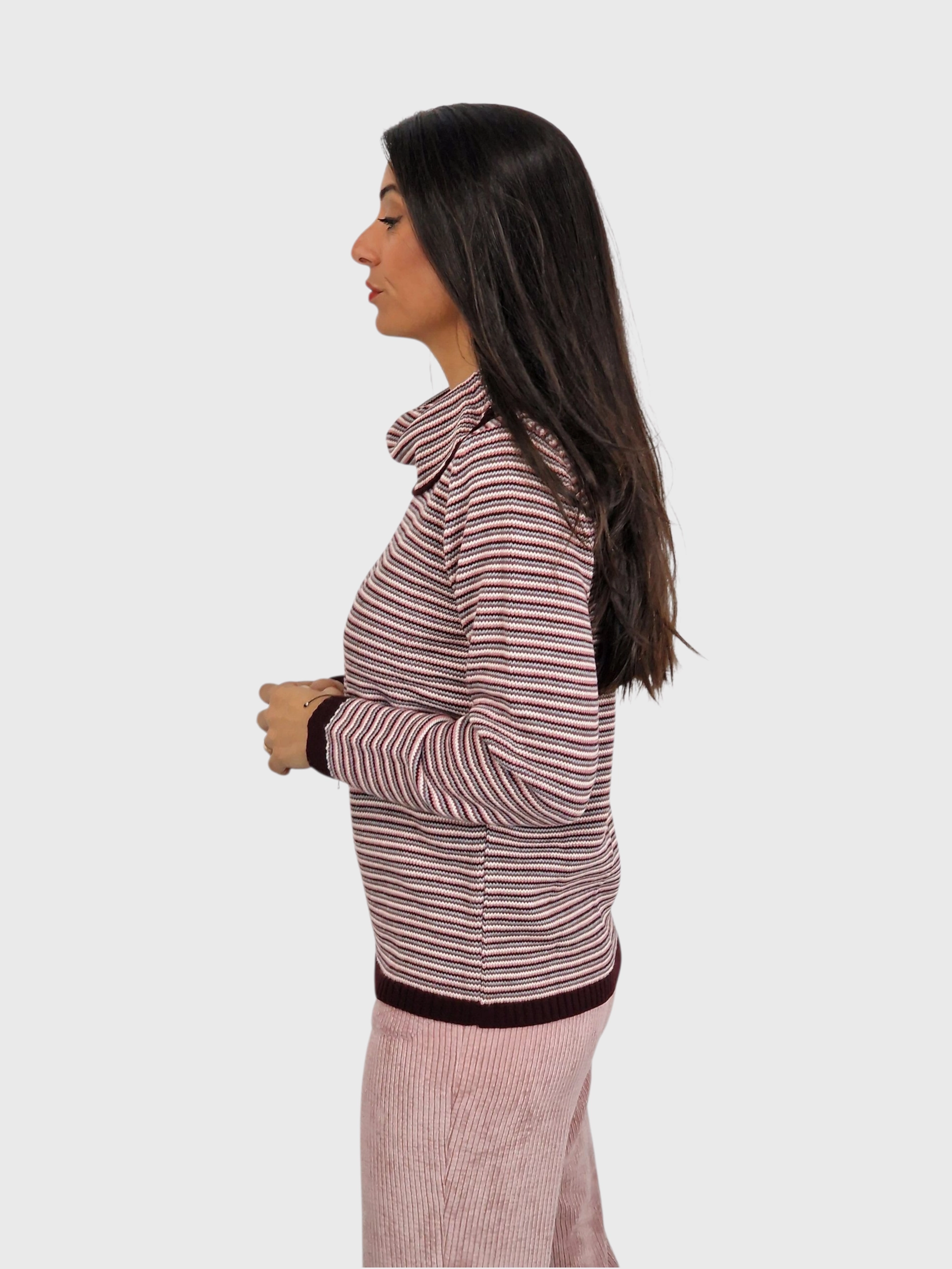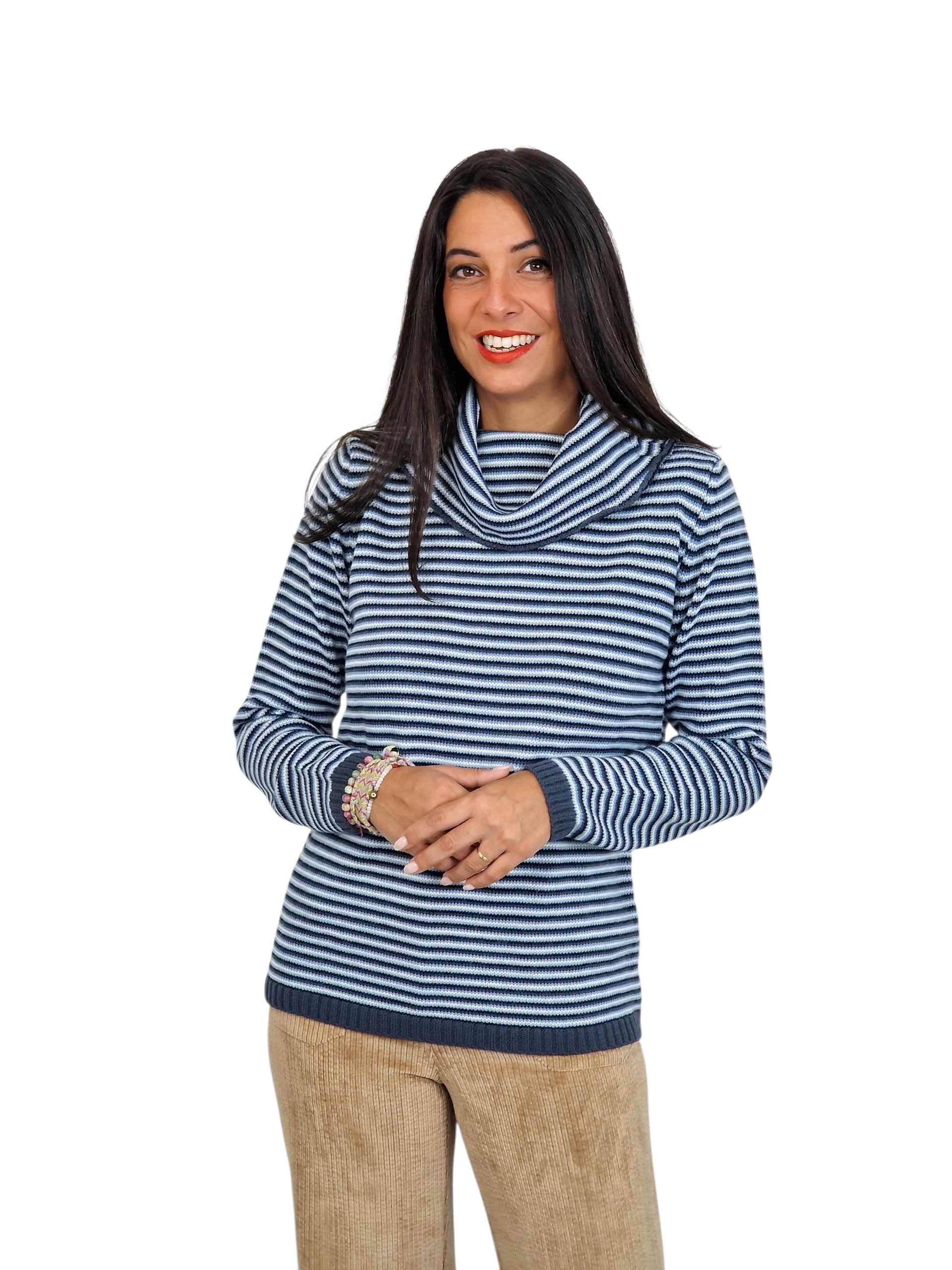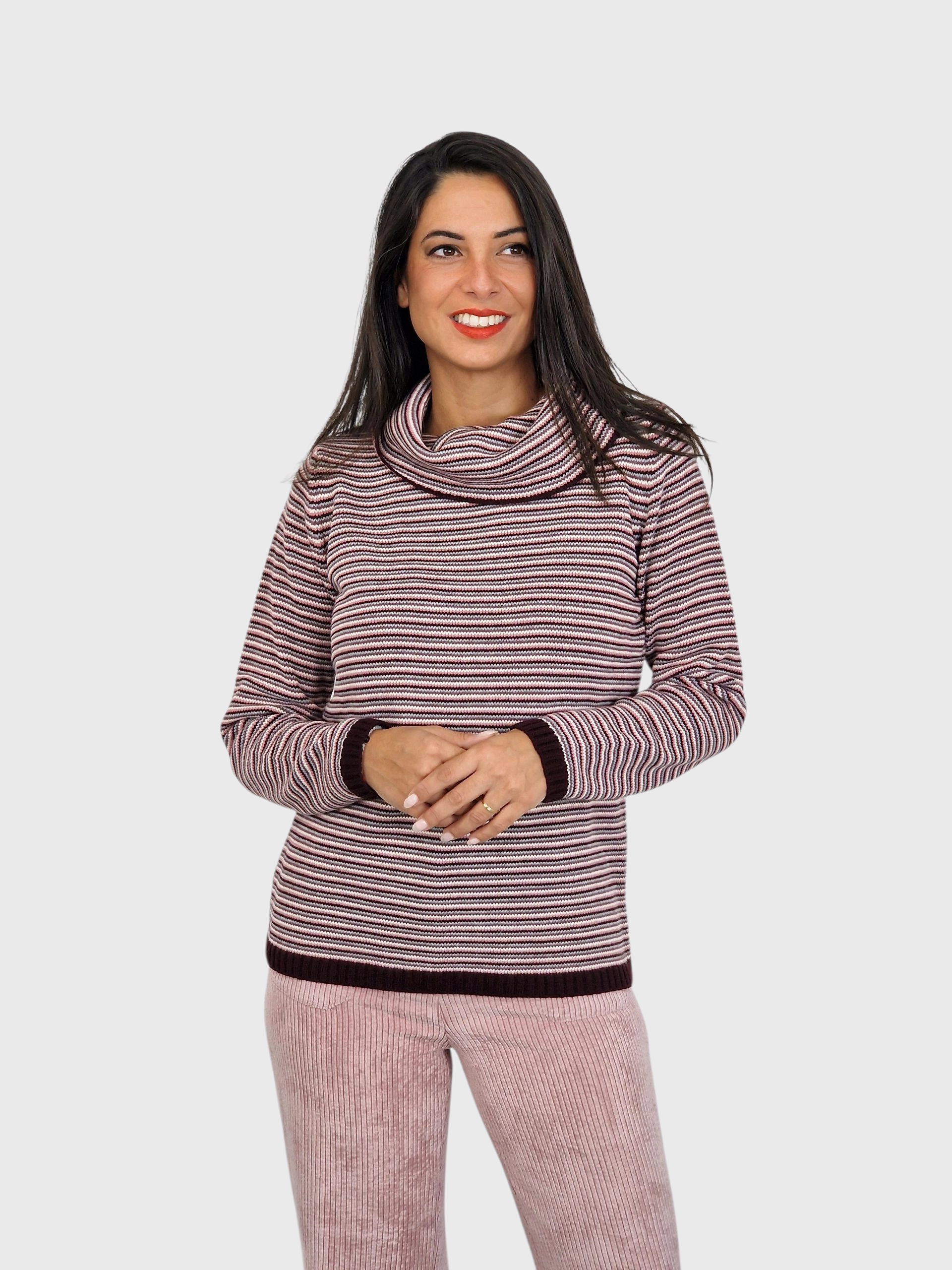 Suéter estampado en rayas finitas y cuello subido desbocado. Disponible en marino, pruma y caramelo.