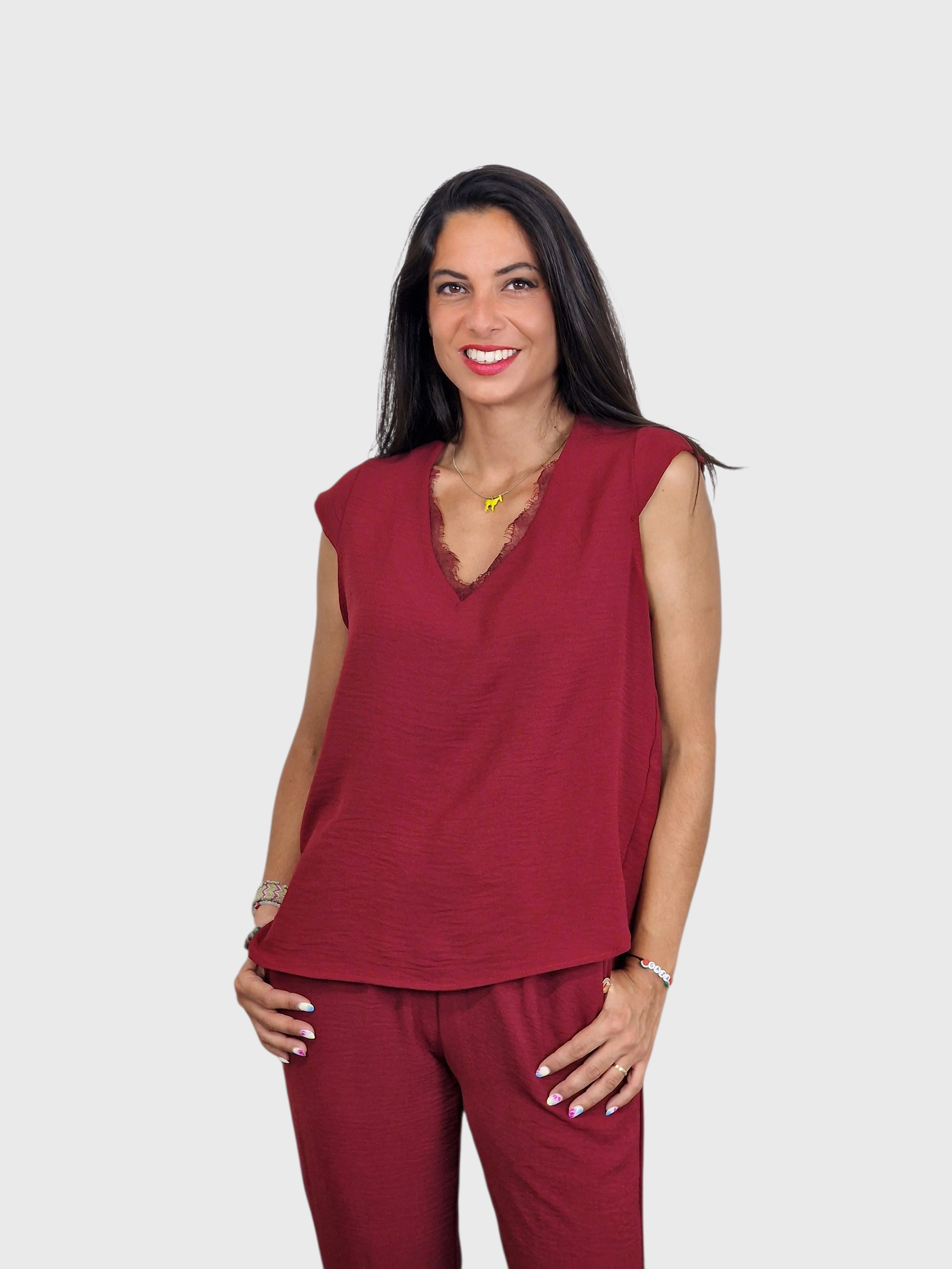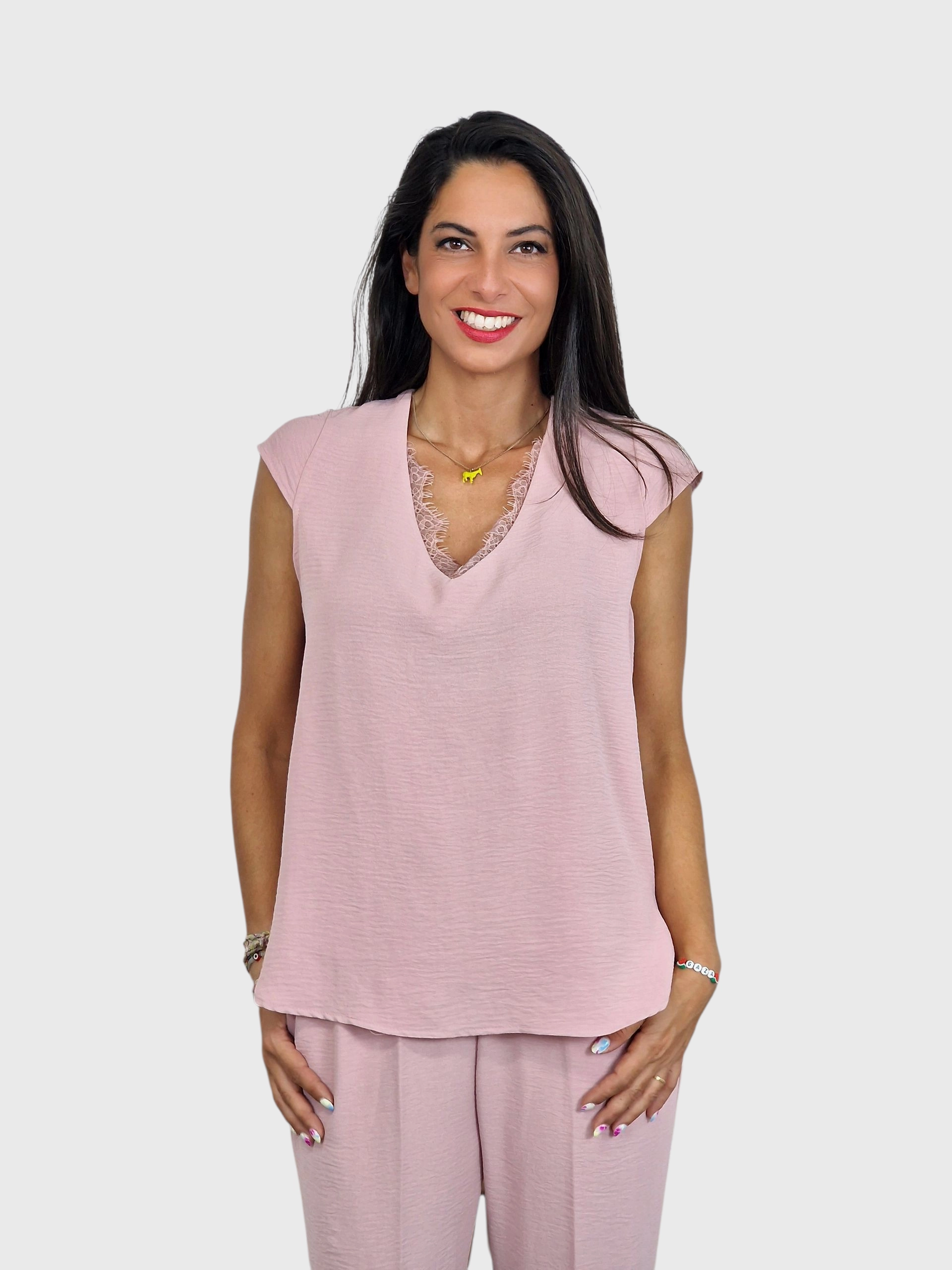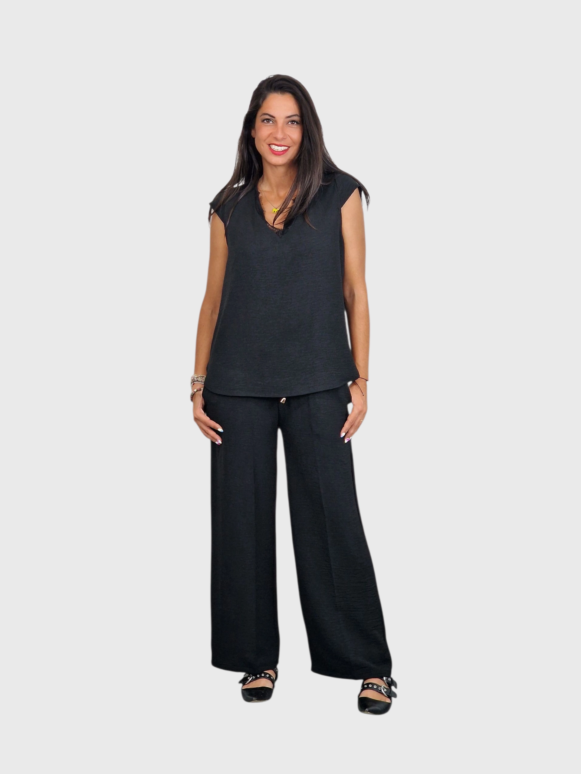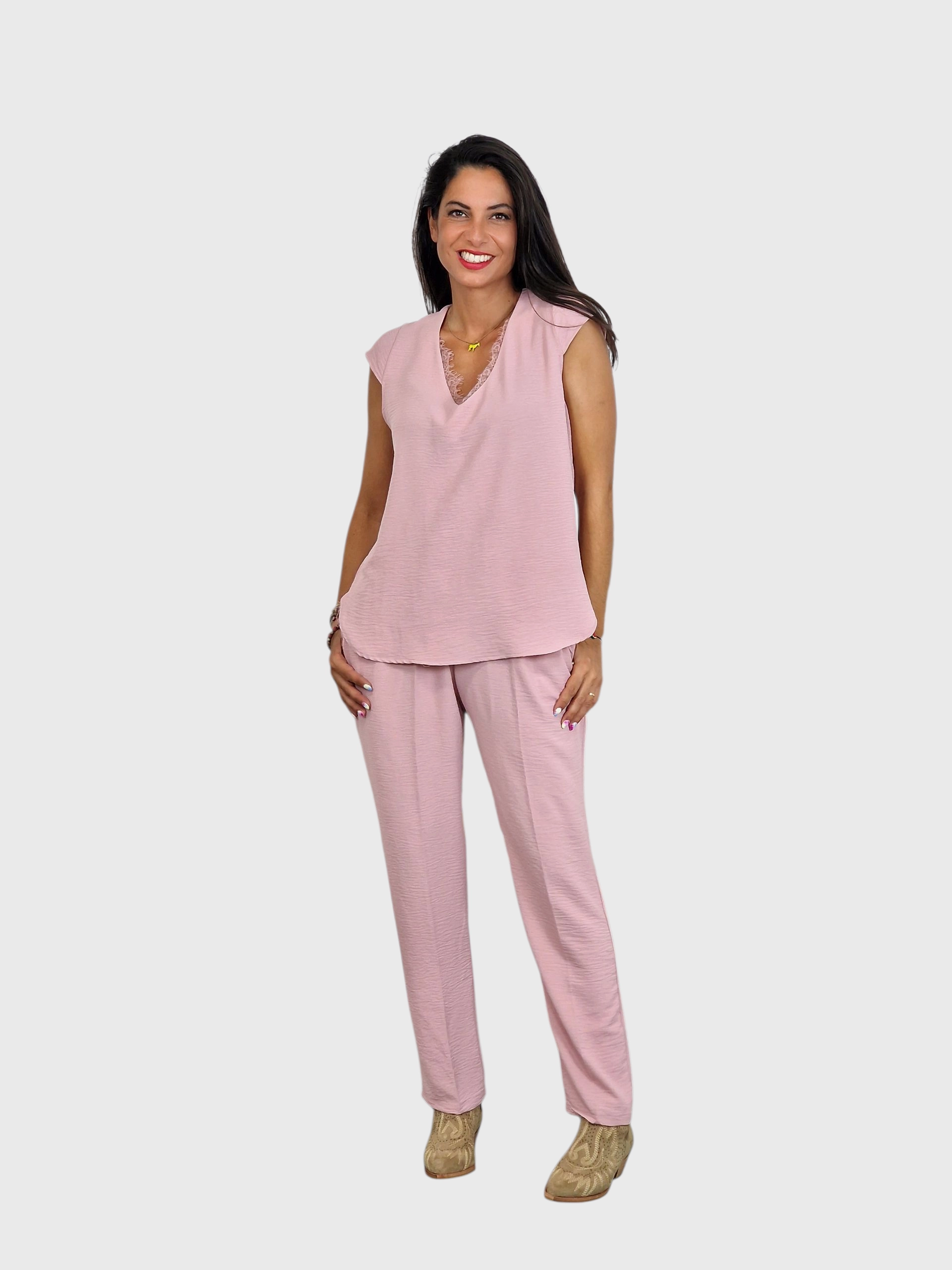 Top lencero de raso sin mangas y escote en pico. A conjunto con pantalón ref. O 40049. Disponible en negro, rosa palo, verde kaki, marrón, crudo y pruma.