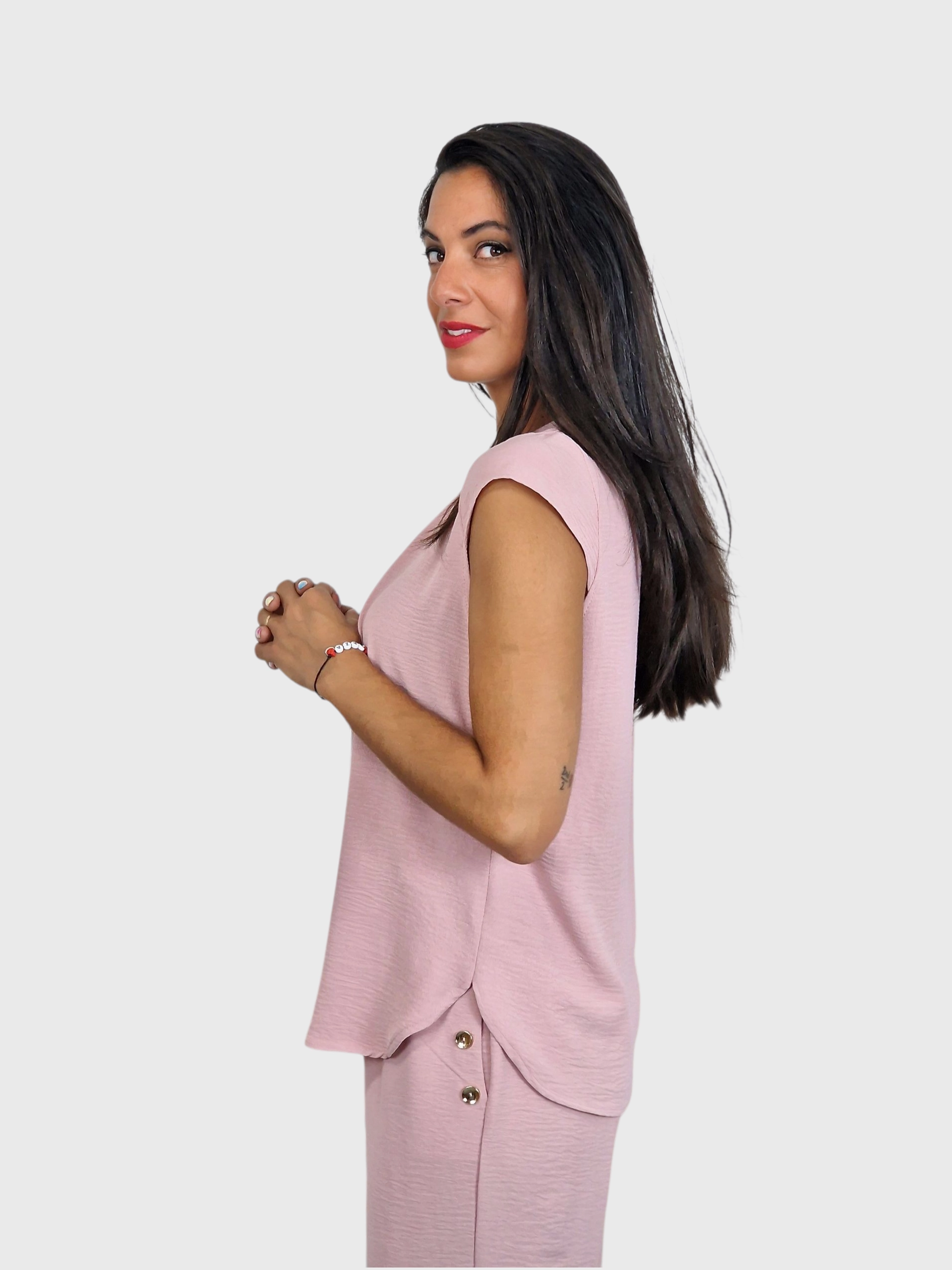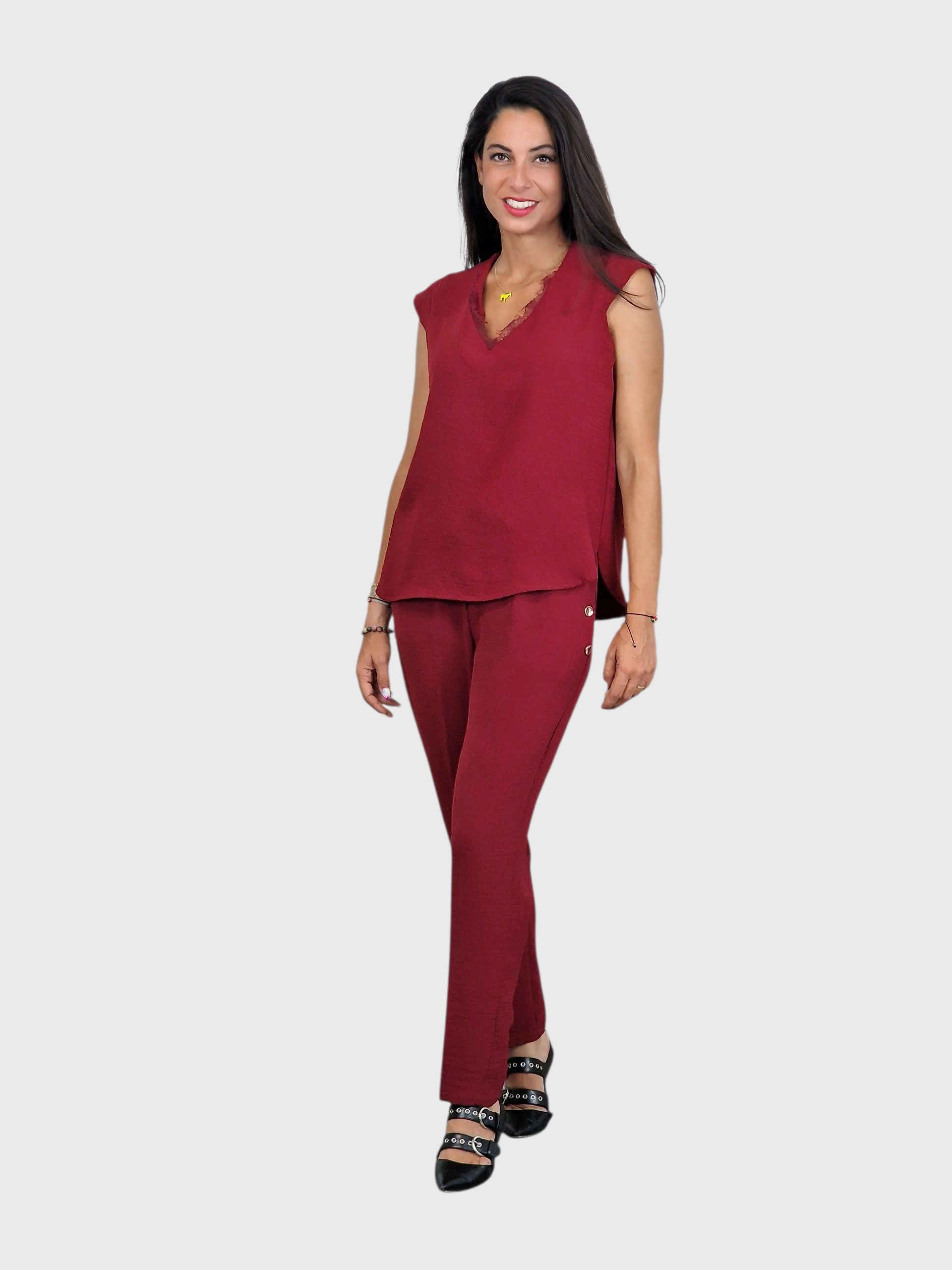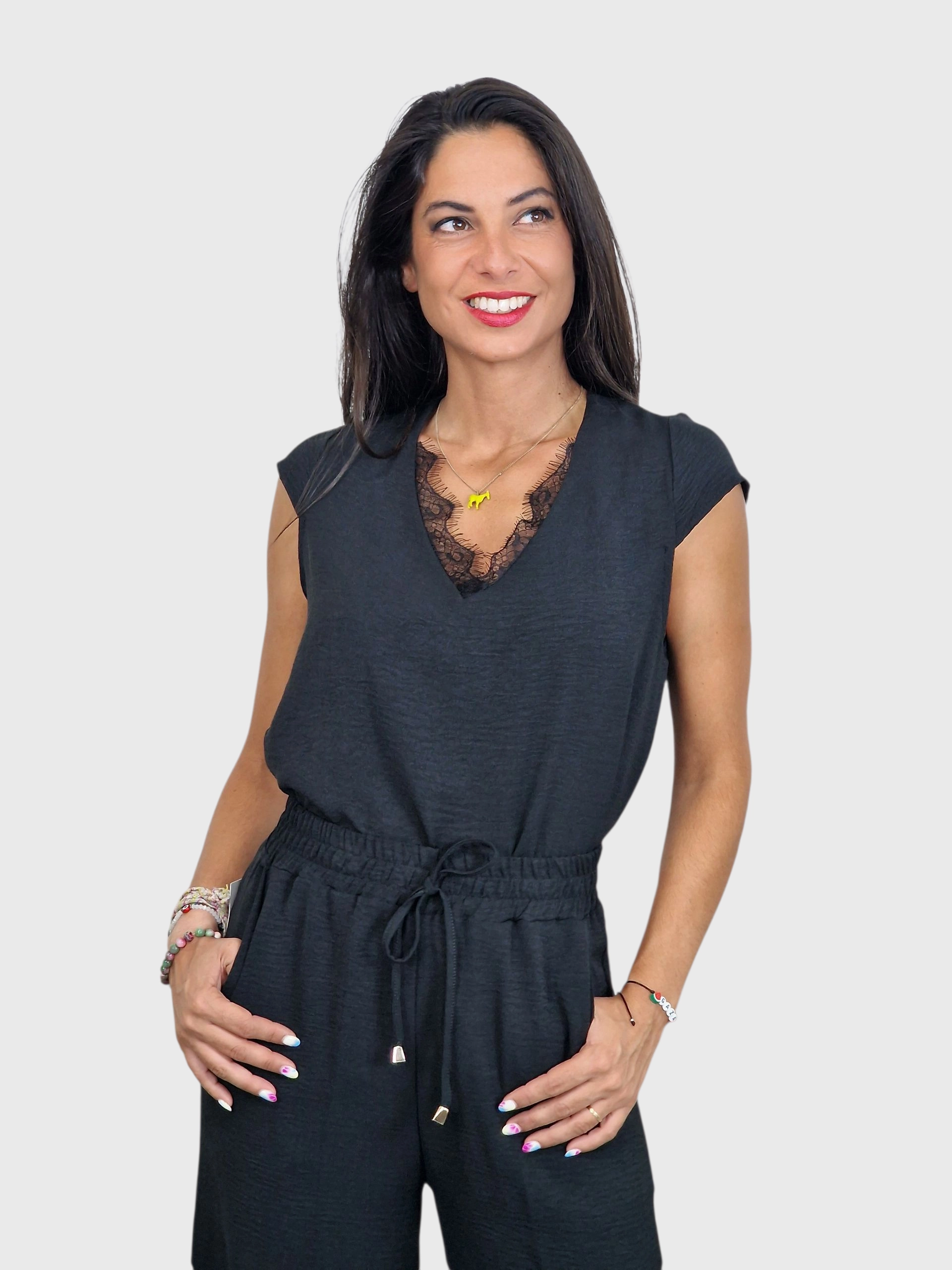 Top lencero de raso sin mangas y escote en pico. A conjunto con pantalón ref. O 40049. Disponible en negro, rosa palo, verde kaki, marrón, crudo y pruma.