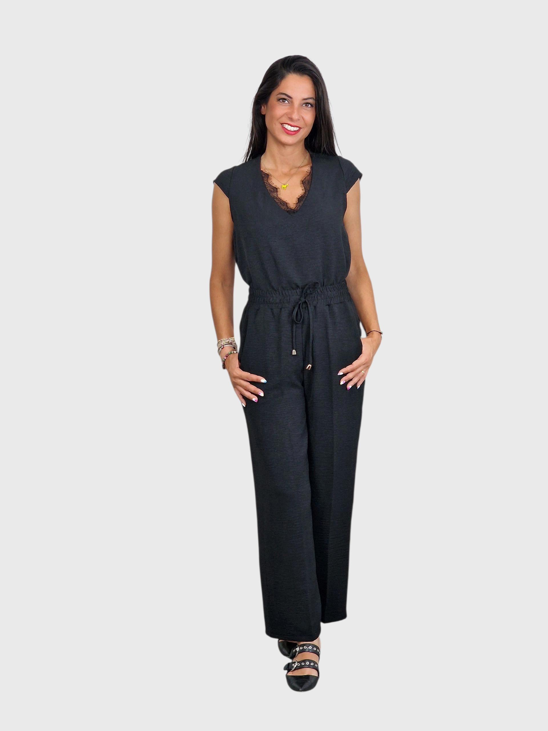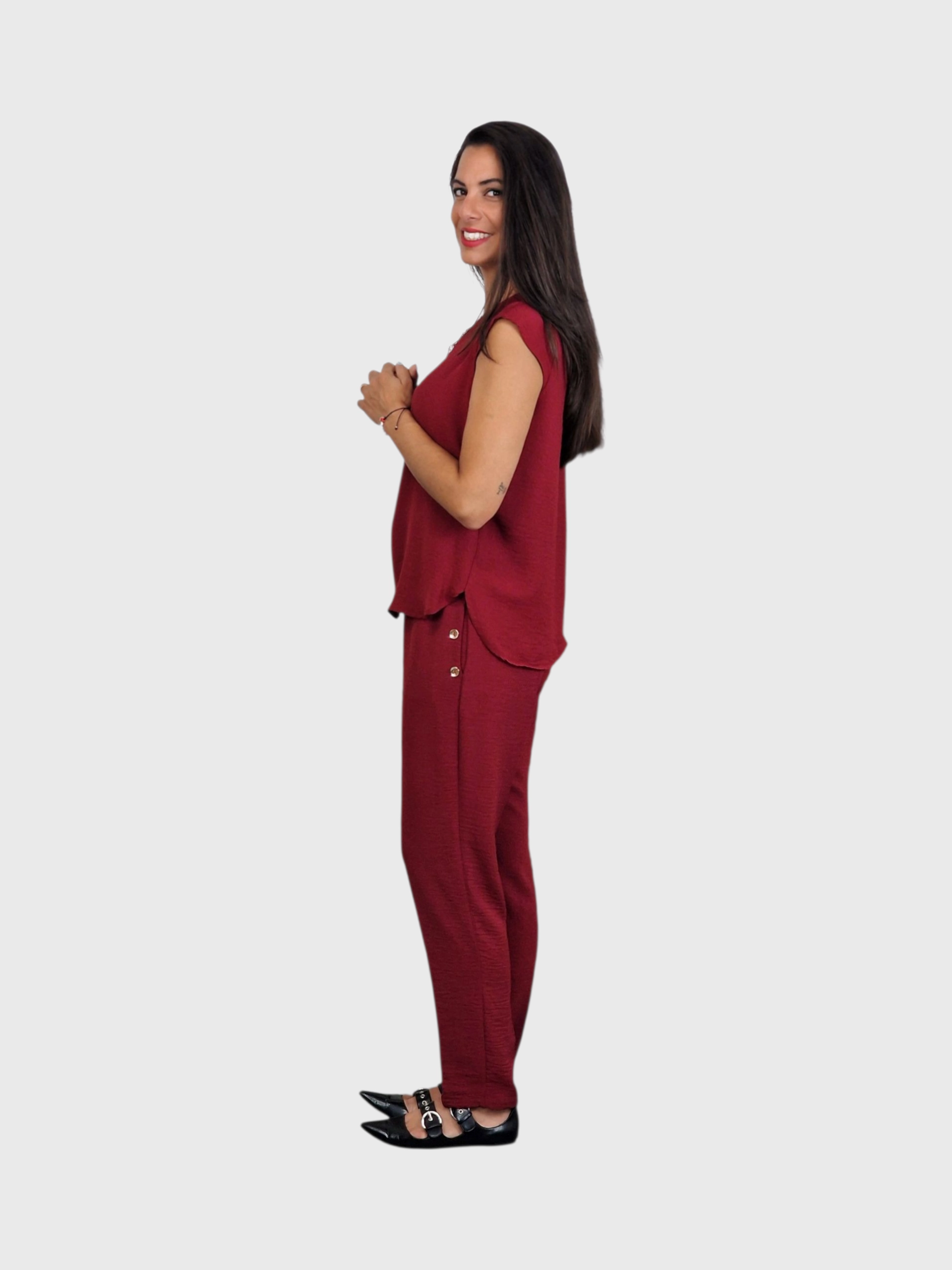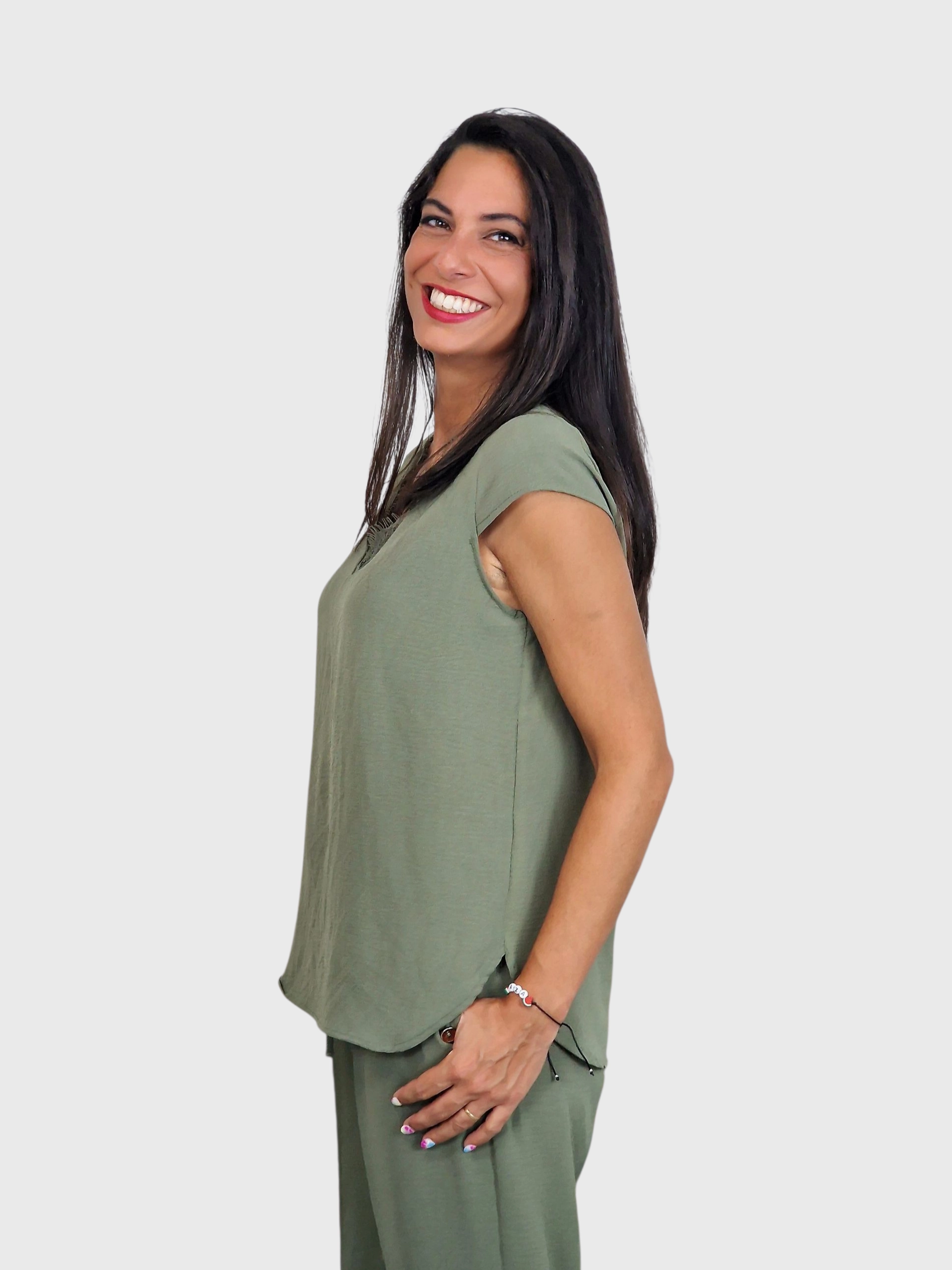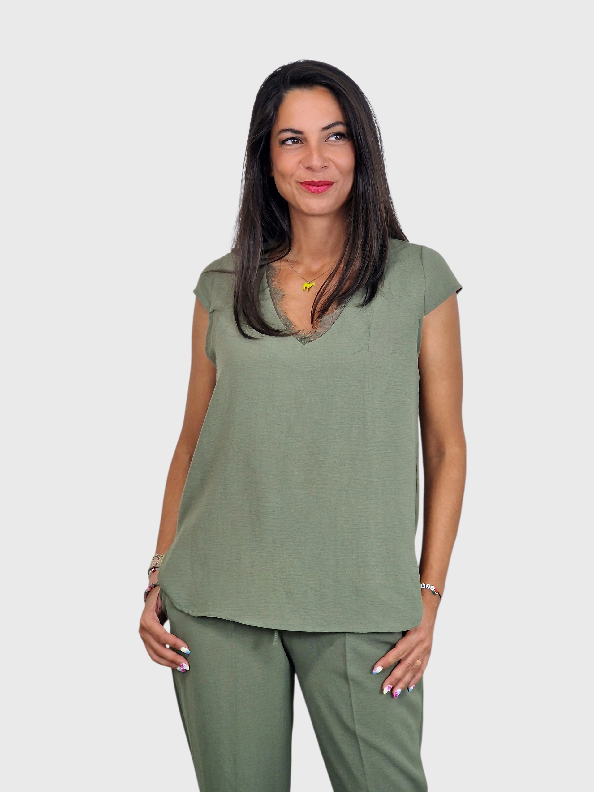 Top lencero de raso sin mangas y escote en pico. A conjunto con pantalón ref. O 40049. Disponible en negro, rosa palo, verde kaki, marrón, crudo y pruma.