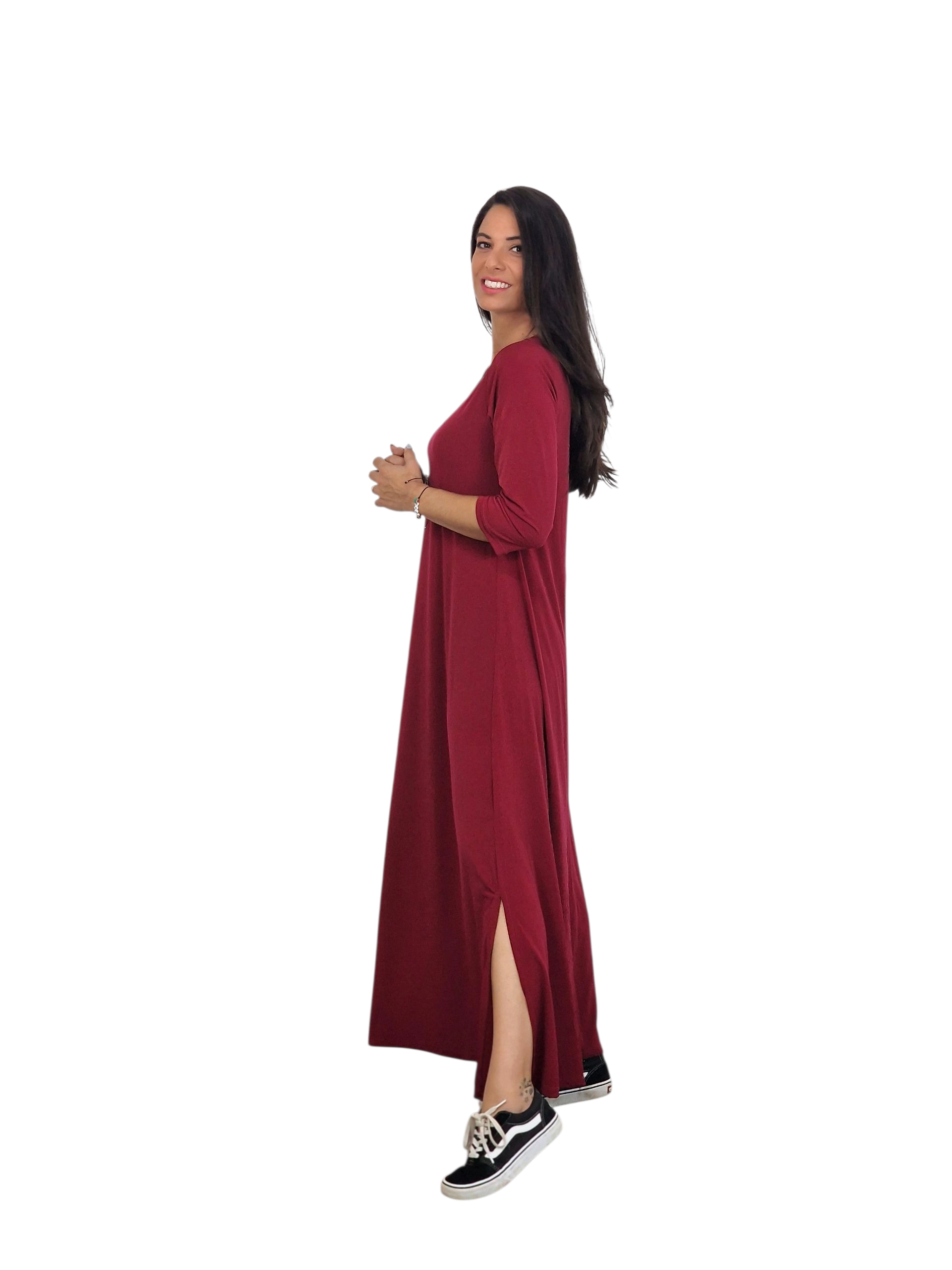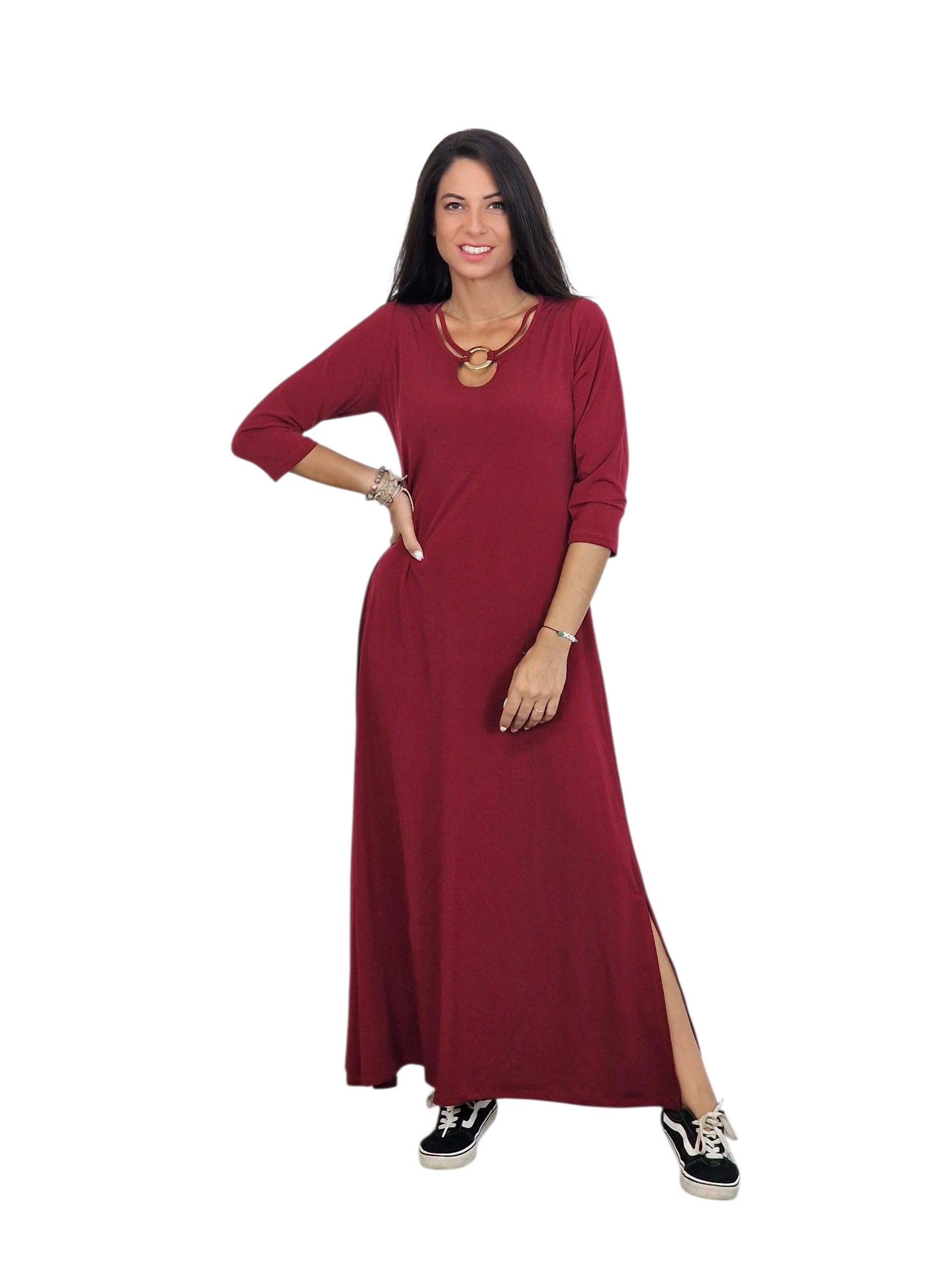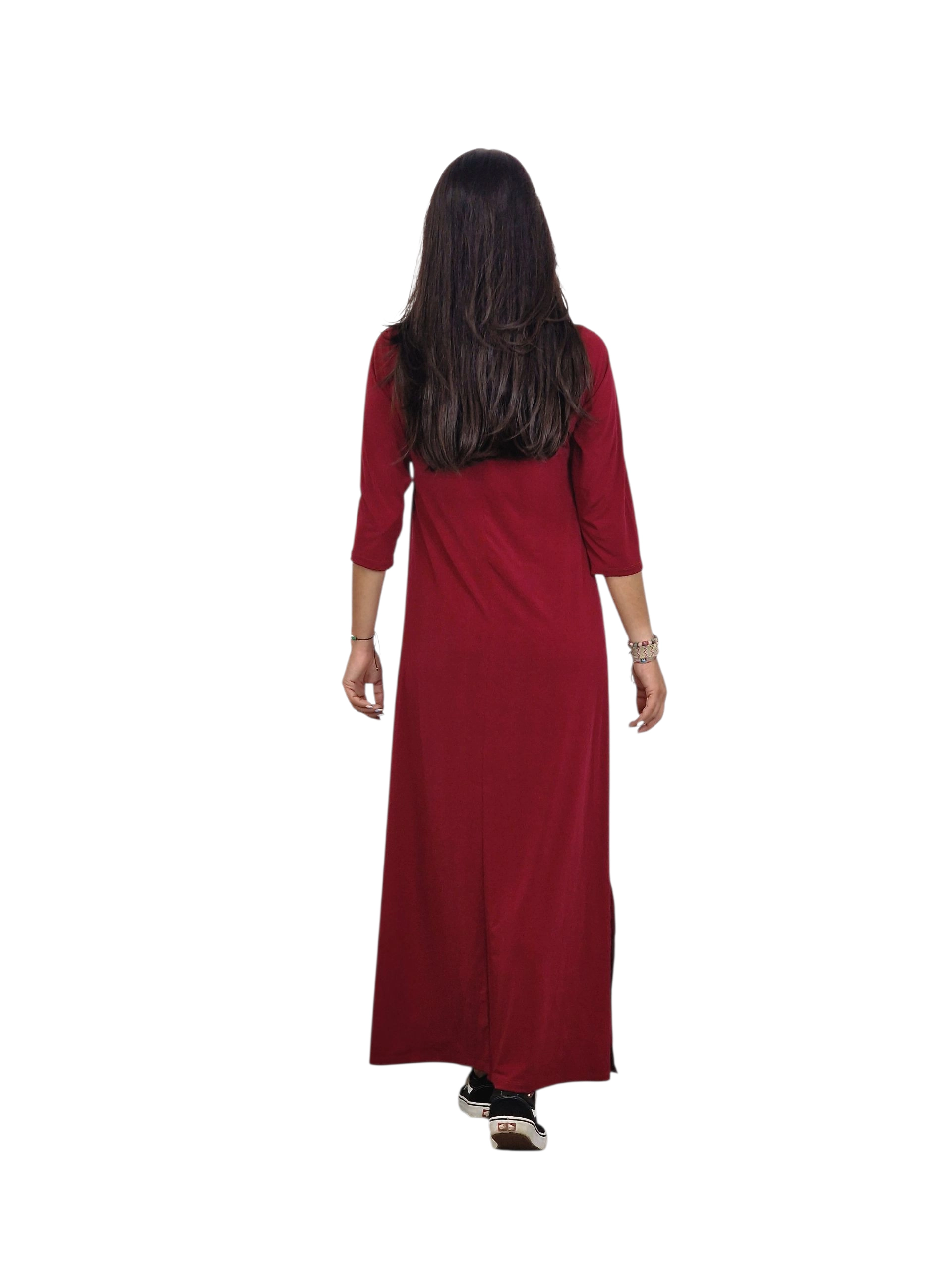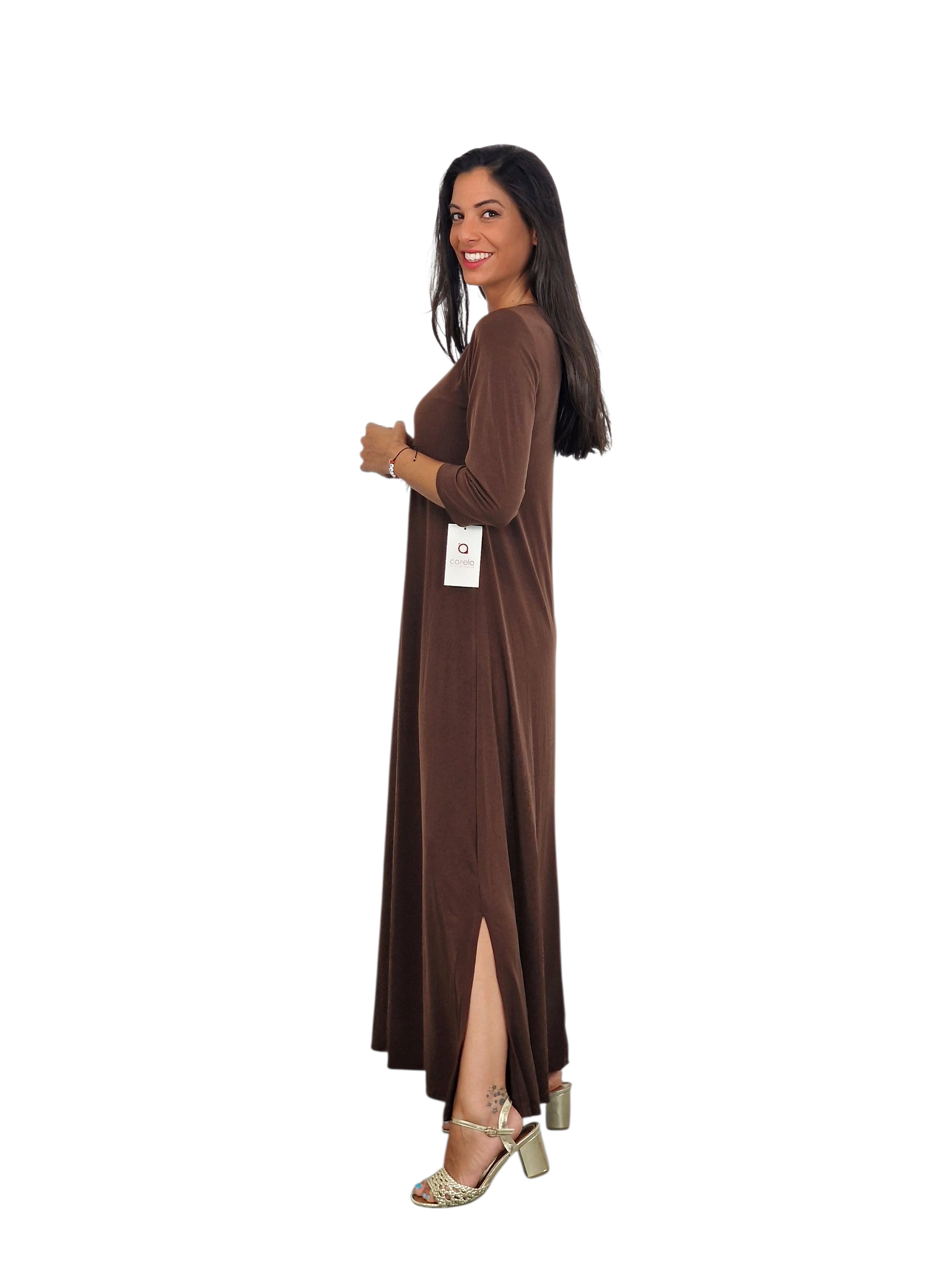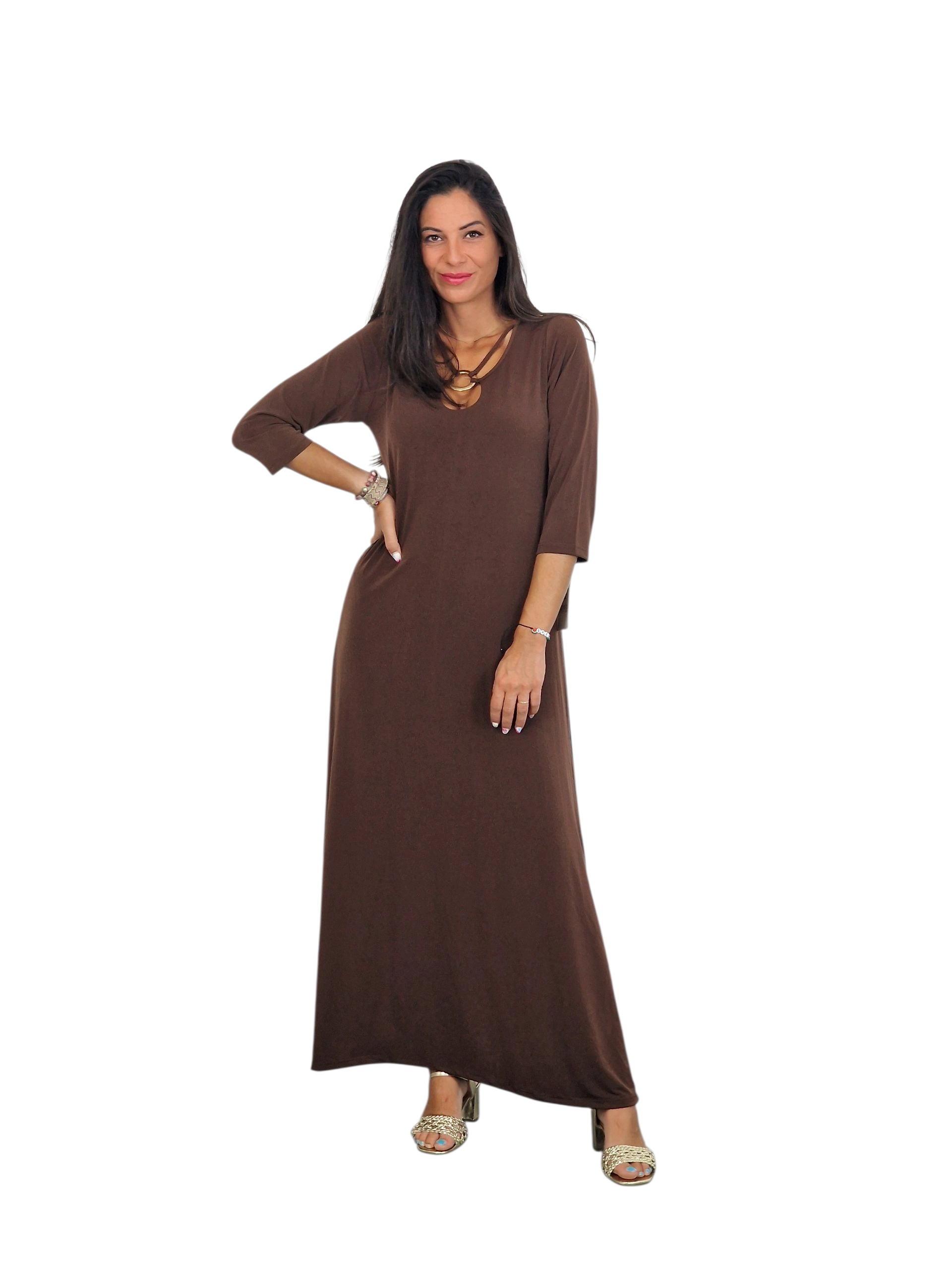 Vestido largo de punto frío, manga tres cuartos, con pequeña abertura lateral y estampado en V con detalle de aro a la altura del pecho. Disponible en negro, granate y marrón chocolate.