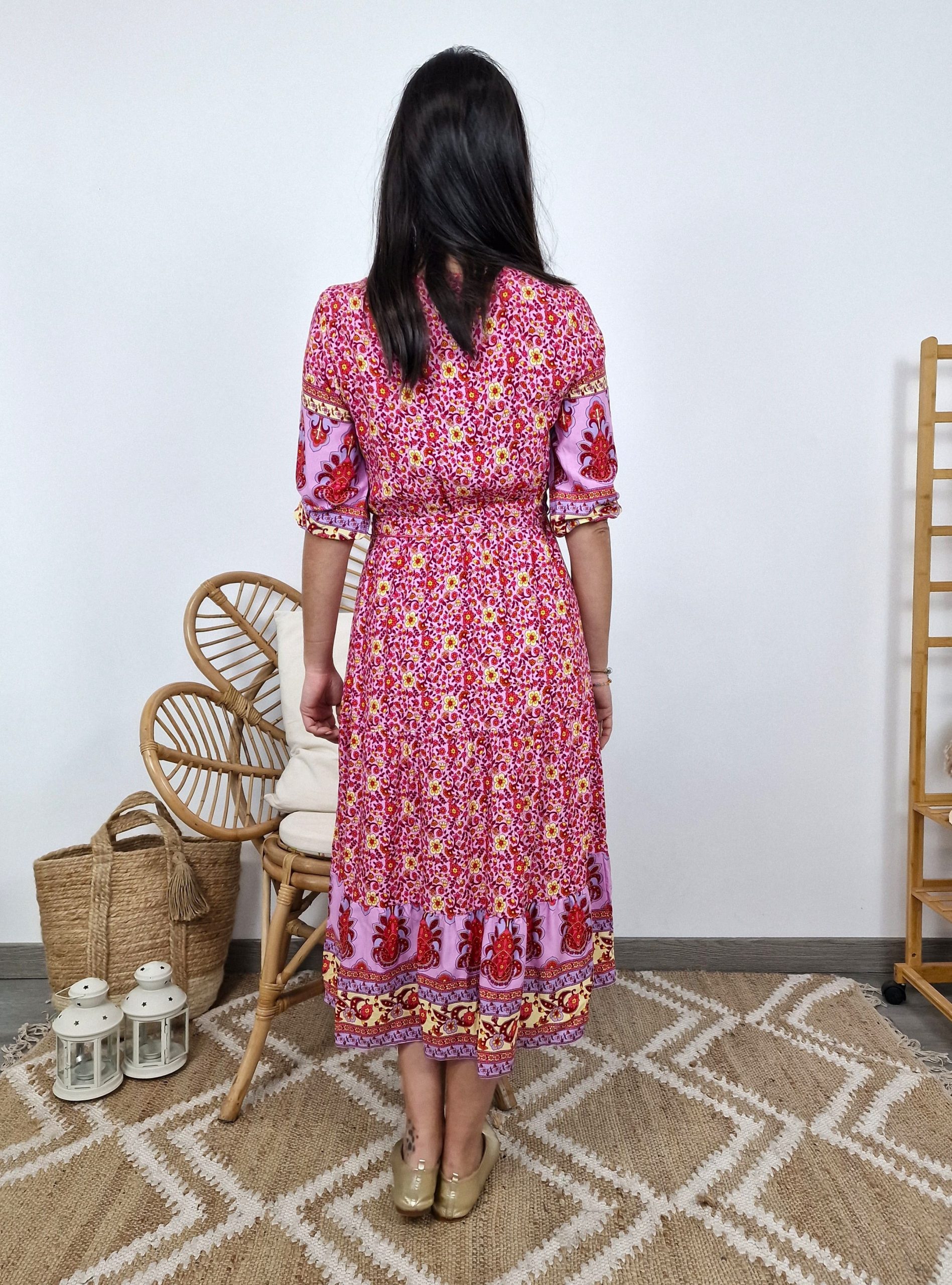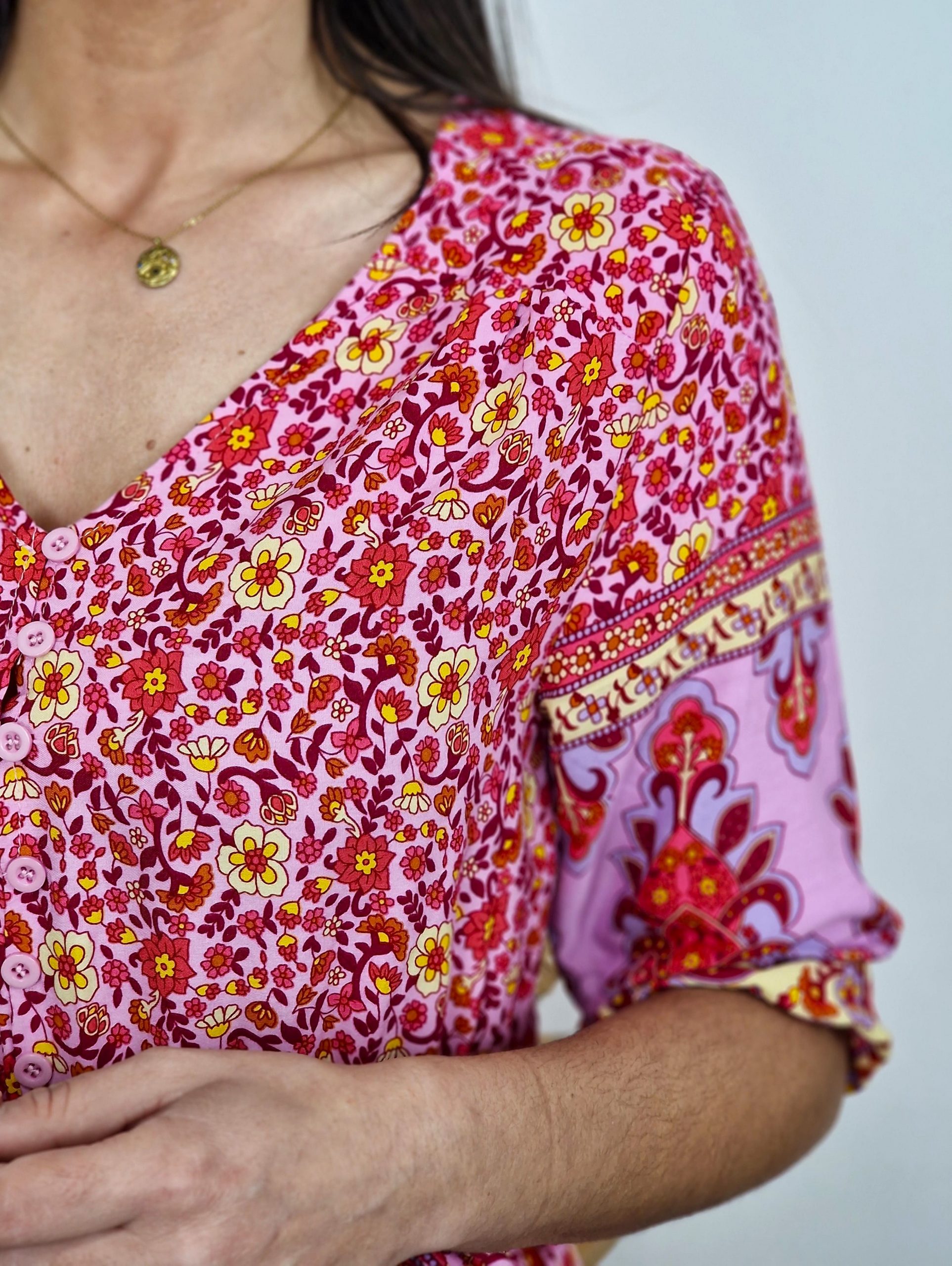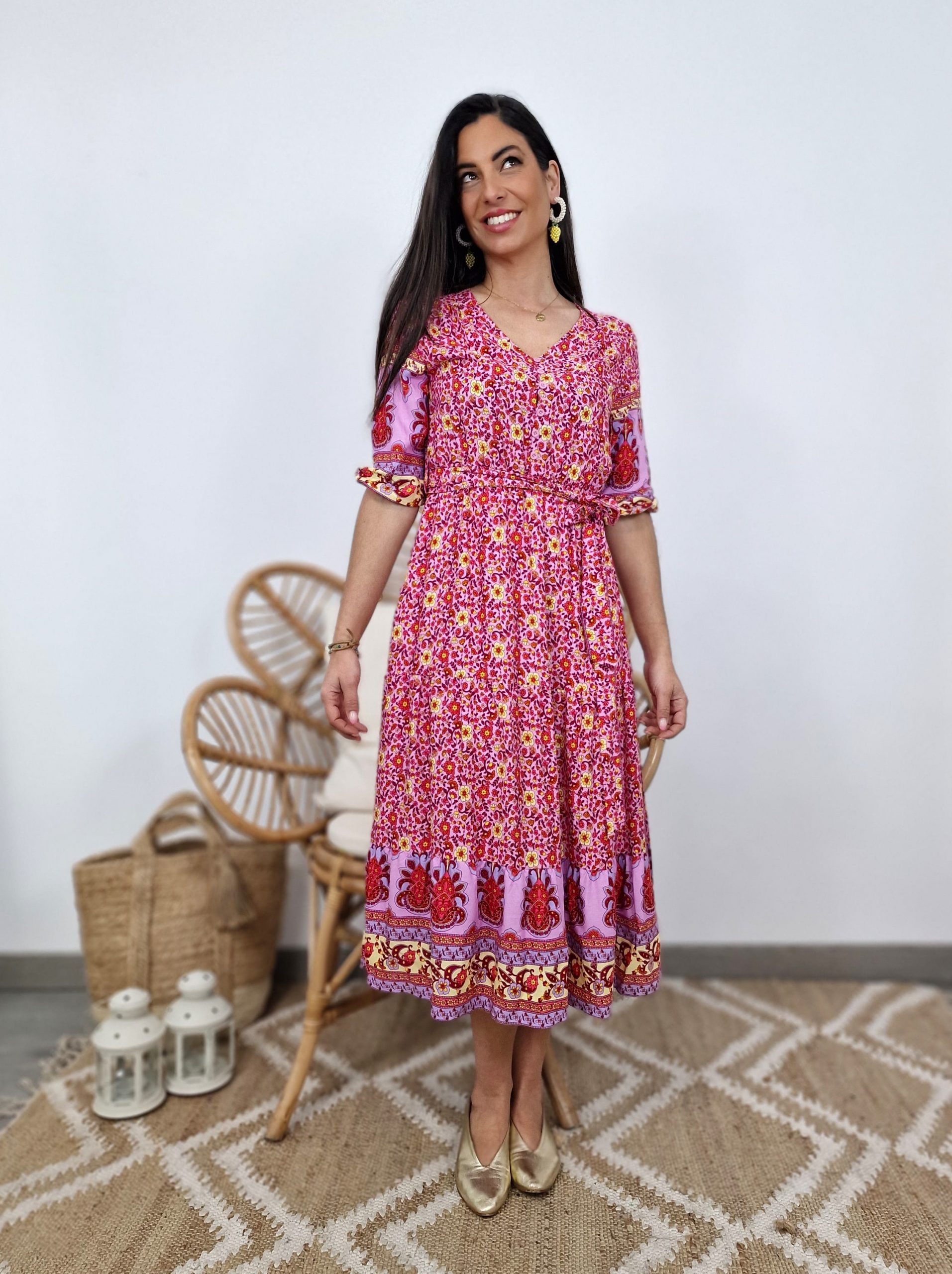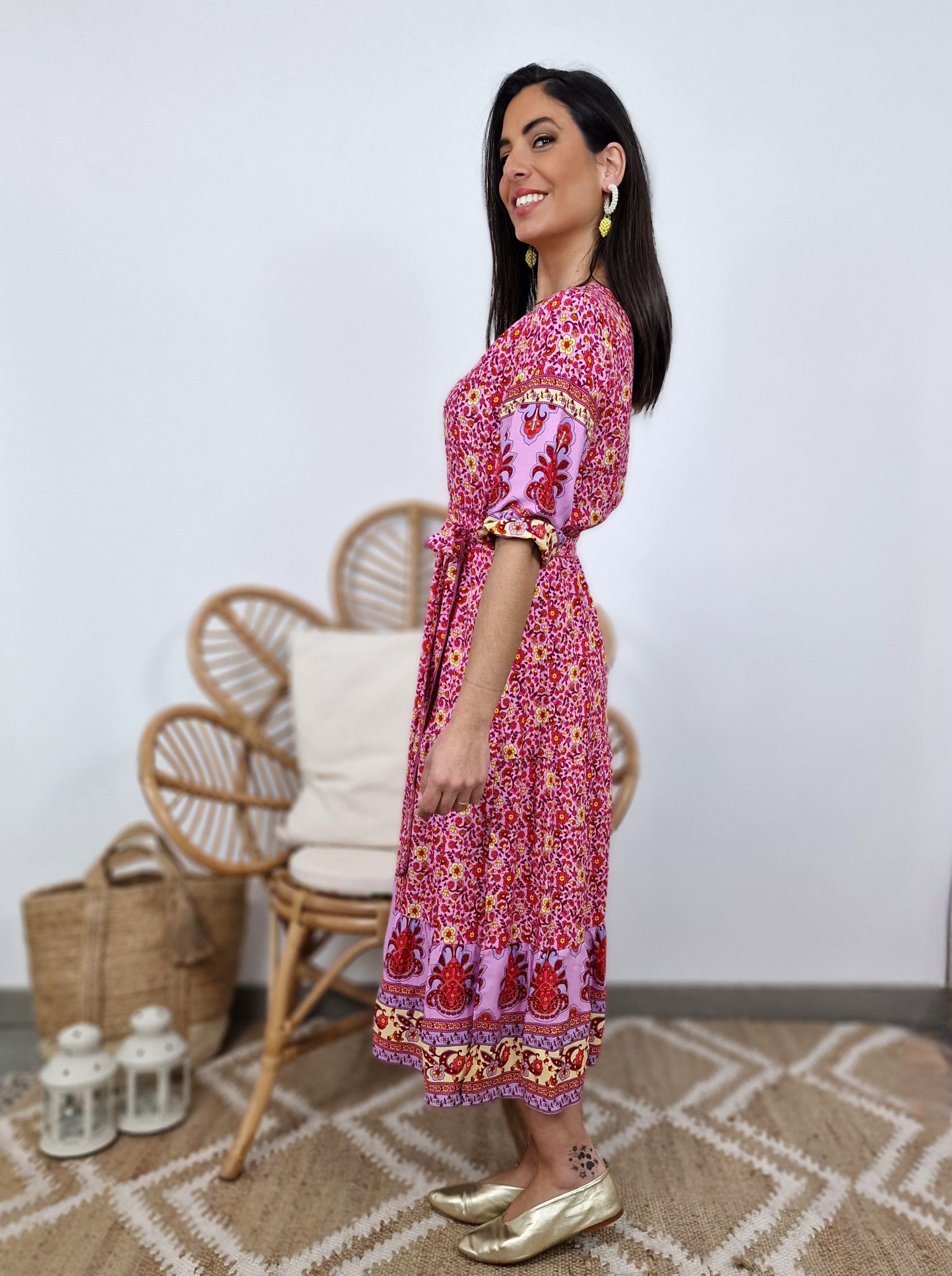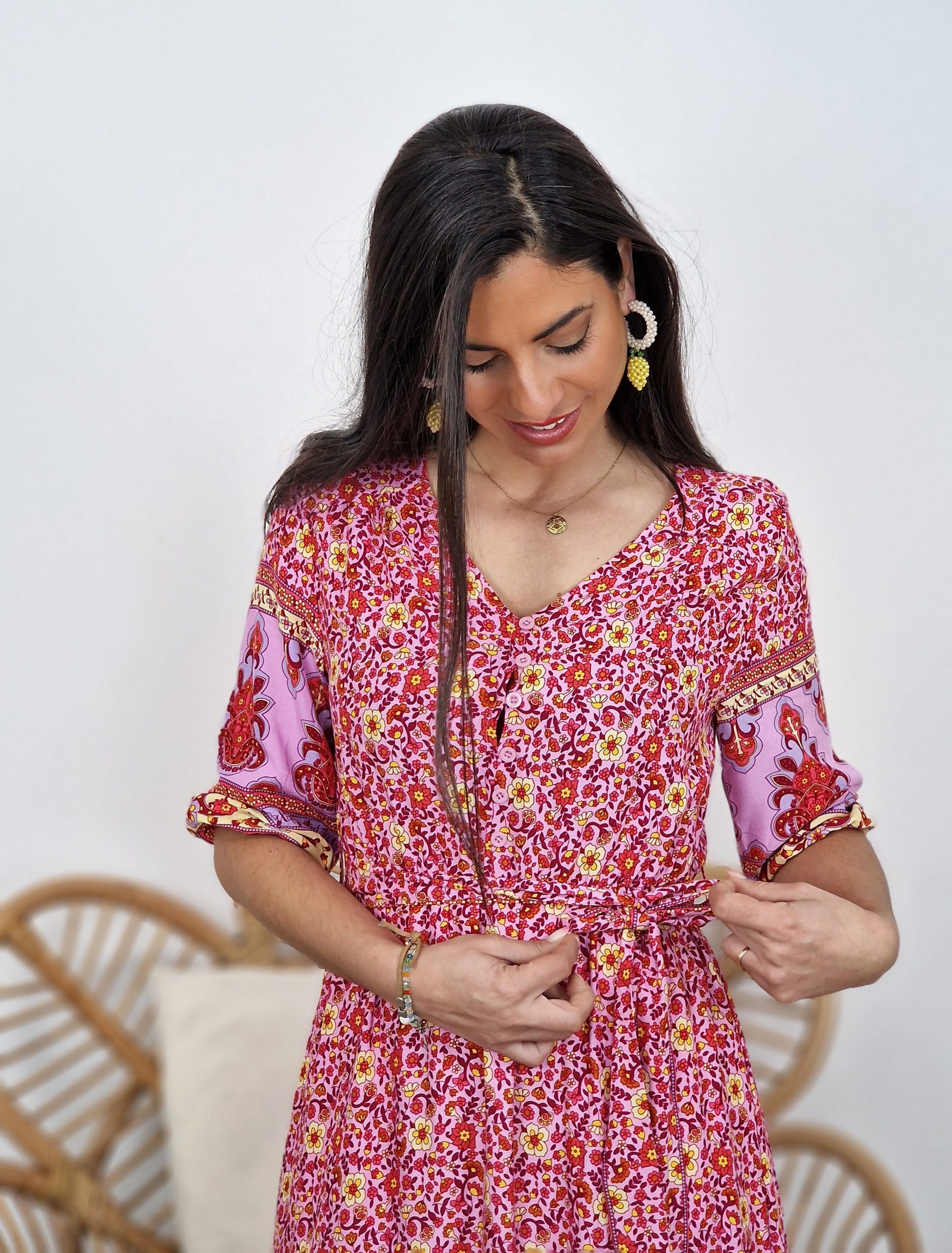 Vestido midi con estampado de flores, de manga francesa, con escote redondo, botones centrales hasta la cintura, cinto del mismo tejido y falda con vuelo y aberturas laterales.