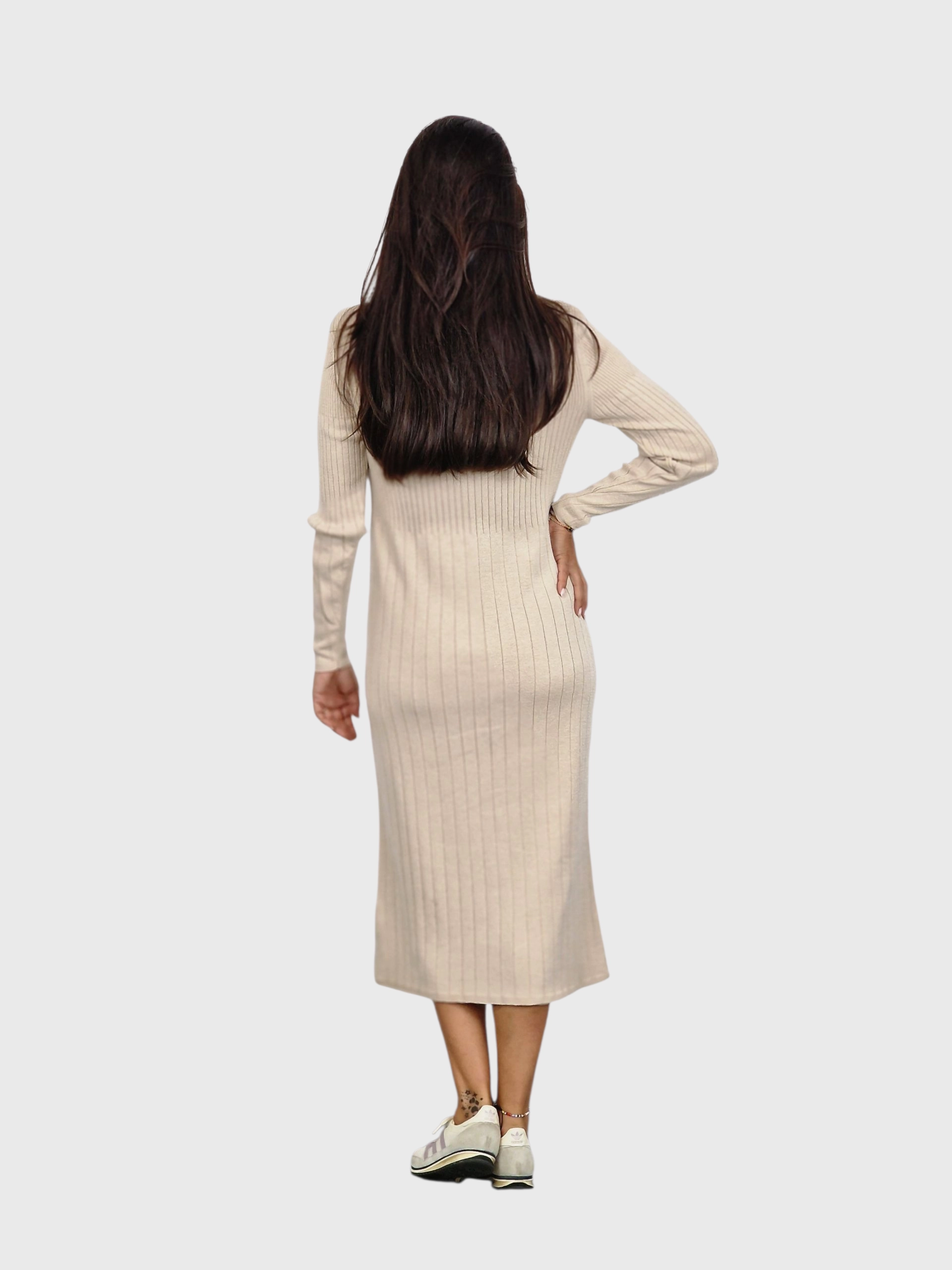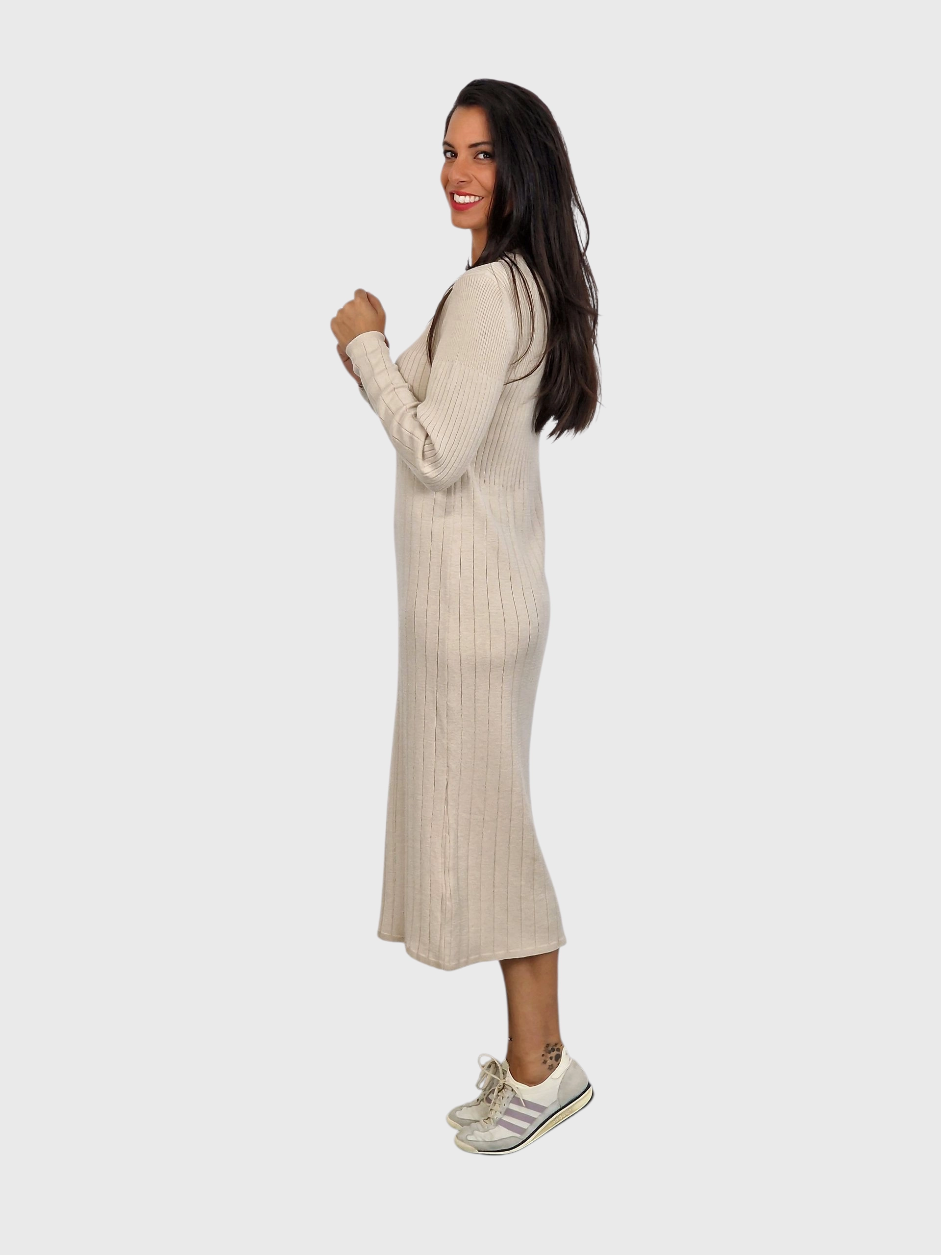 Vestido de punto midi, manga larga en canalé.Disponible en arena y en teja.