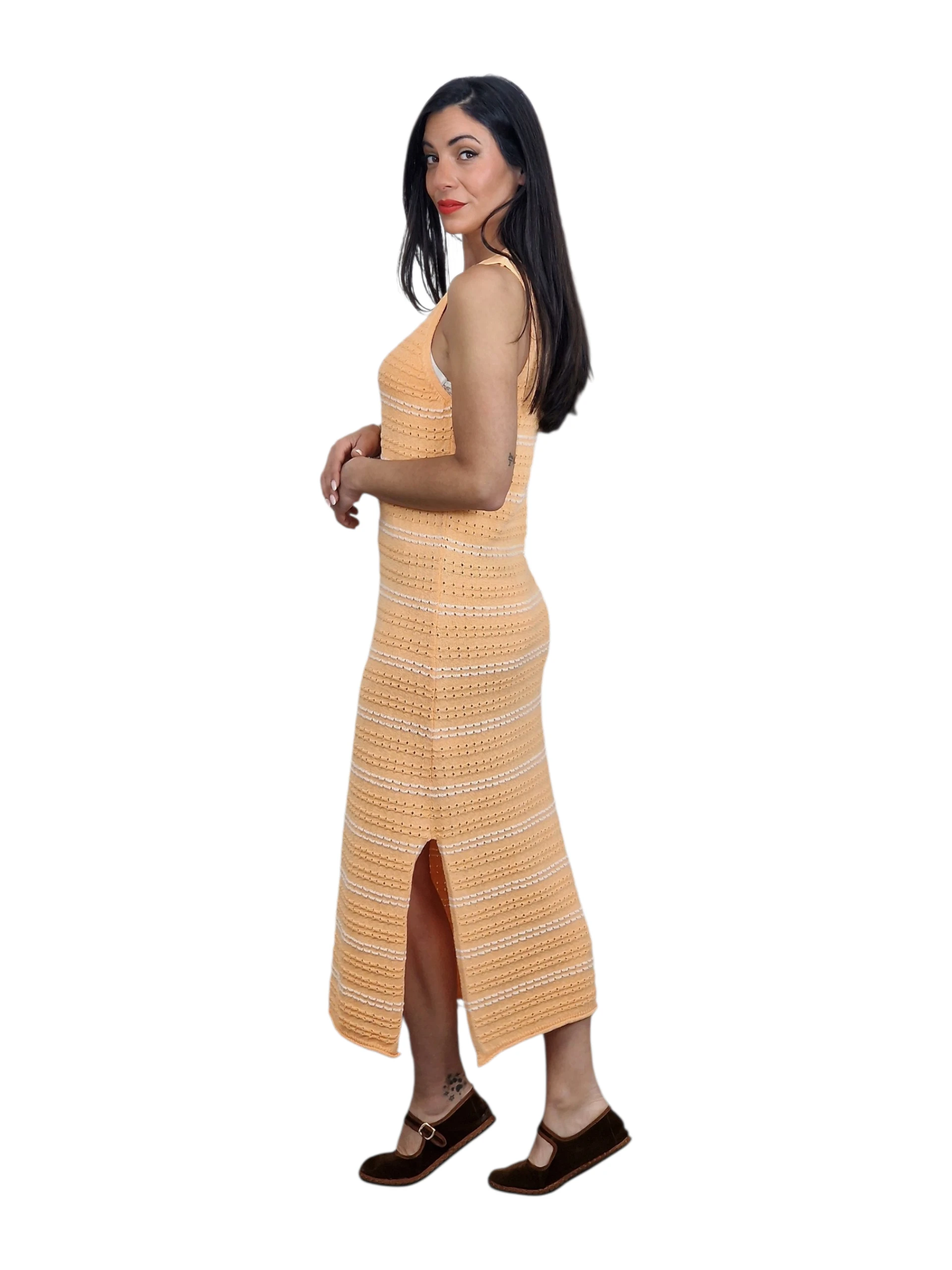 Vestido de punto de sisas, midi, con abertura lateral y escote pico. Disponible en azul marino y papaya.