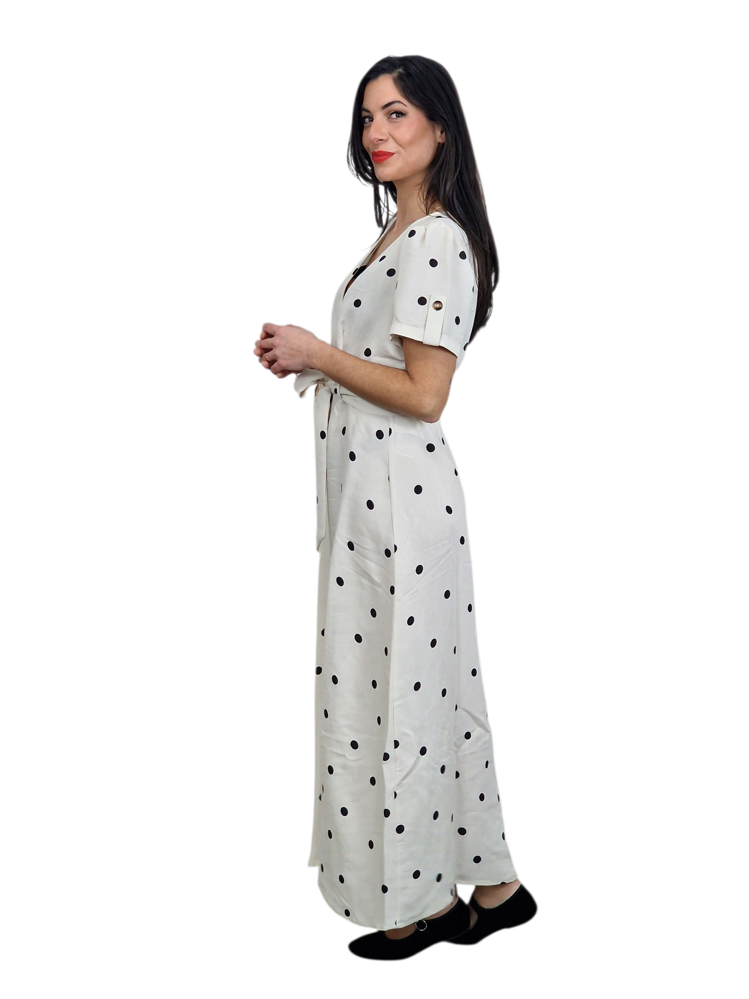 Vestido lady, con cuello pido, manga corta, botones de arriba a abajo, ceñido en la parte superior y un citurón e la cintura desde la que el tejido cae suelto. Disponible en negro y granate